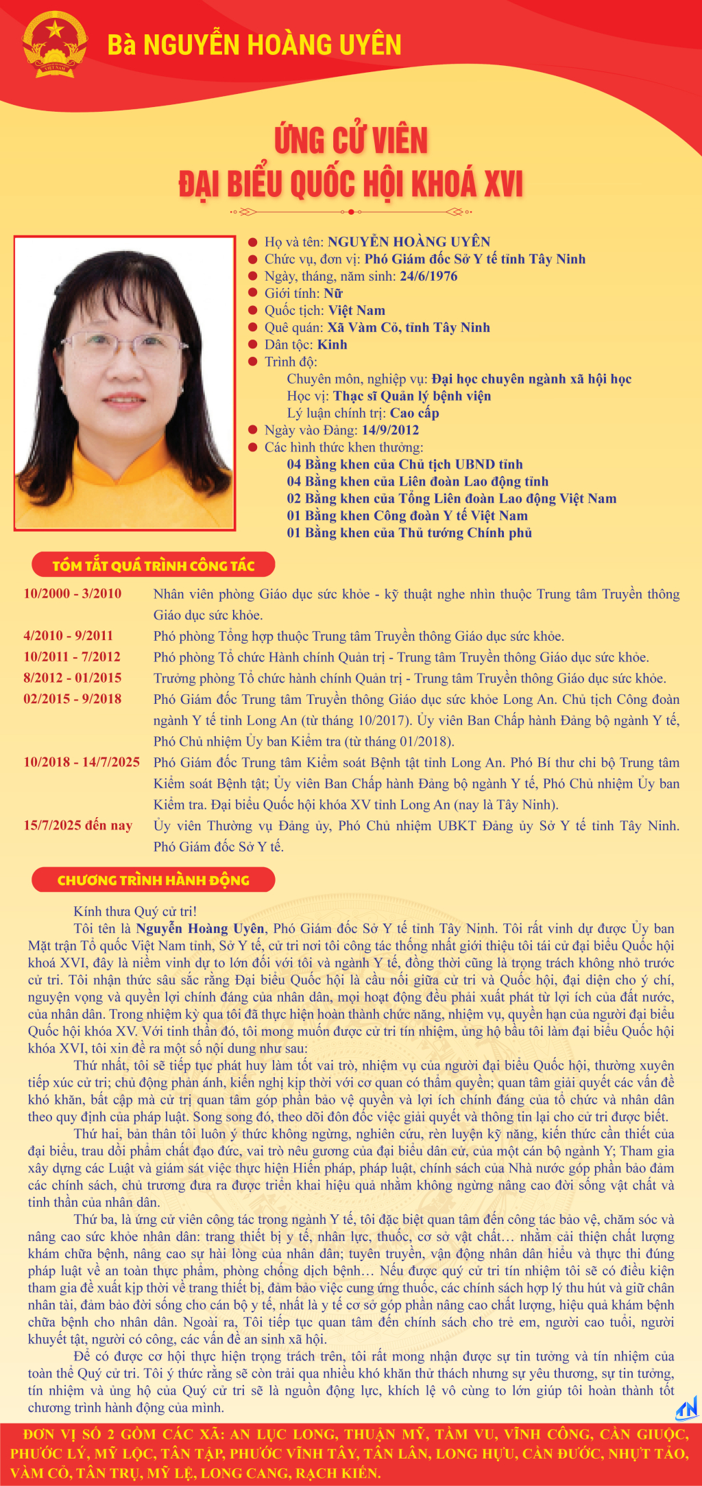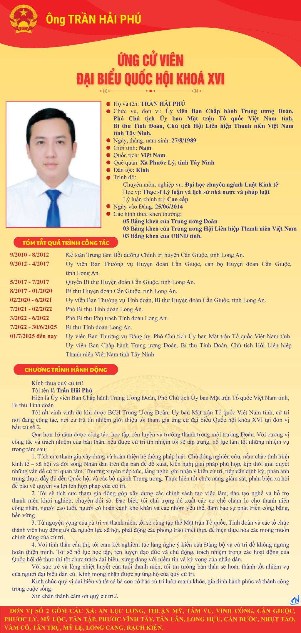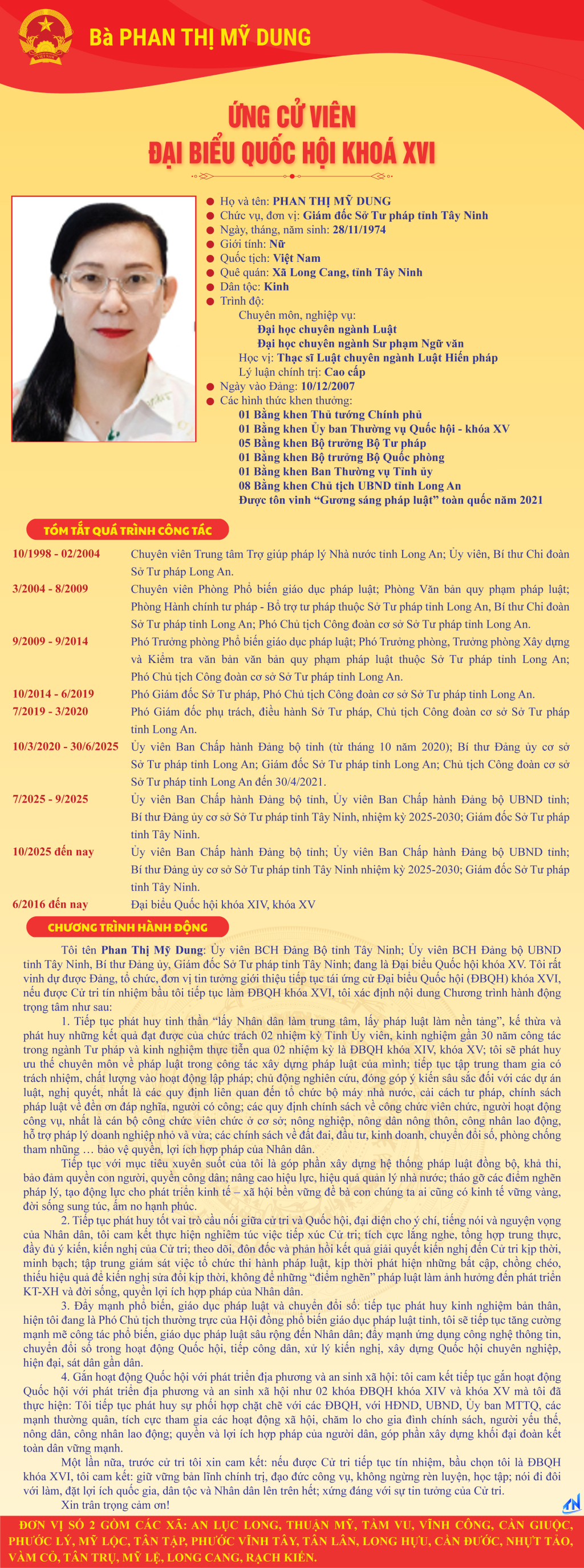 Tóm tắt quá trình công tác và chương trình hành động của người ứng cử đại biểu Quốc hội khóa XVI theo từng đơn vị bầu cử tỉnh Tây Ninh (Đơn vị bầu cử số 2)
