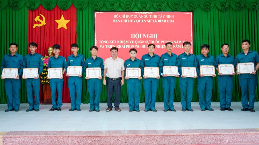 Dịp này, UBND xã Bình Hòa tặng Giấy khen cho 2 tập thể, 12 cá nhân có thành tích tốt trong thực hiện nhiệm vụ quân sự - quốc phòng năm 2025./.
