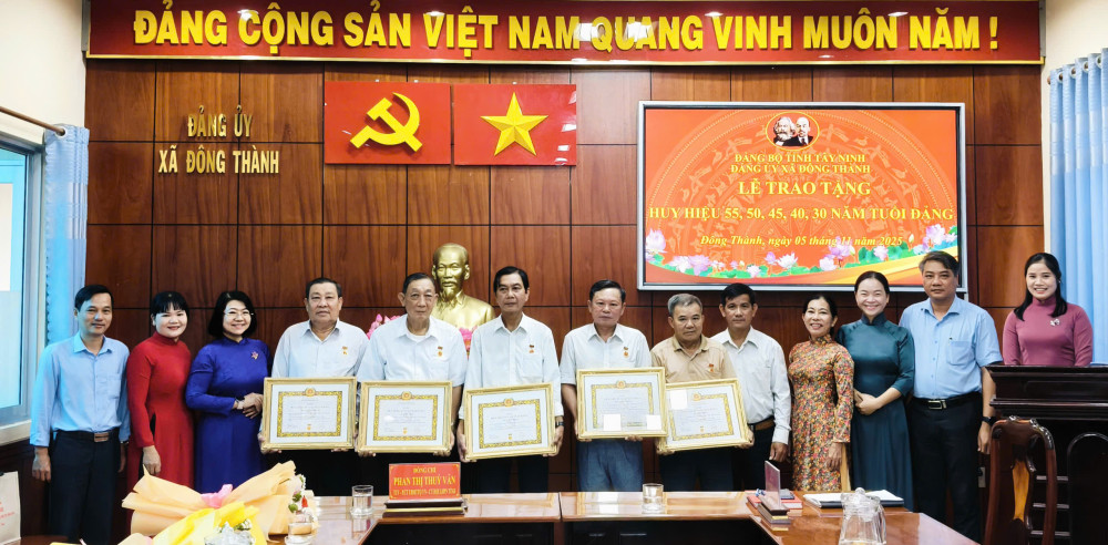 (BTNO) - Chiều 05/11, Đảng ủy xã Đông Thành tổ chức lễ trao Huy hiệu 55, 50, 45, 40 và 30 năm tuổi Đảng cho các đảng viên cao niên đang sinh hoạt tại các chi bộ ấp trên địa bàn xã.