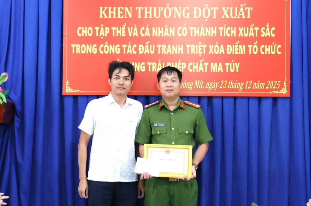 Tại buổi lễ, Bí thư Đảng ủy, Chủ tịch HĐND xã Truông Mít Trần Thị Huy Hoàng khen thưởng cho tập thể Công an xã và 5 cá nhân có thành tích xuất sắc trong chuyên án nêu trên gồm: Phó Trưởng Công an xã Truông Mít Ngô Quốc; cán bộ Công an xã Huỳnh Hải Biển và Trịnh Minh Tủ; Tổ phó Tổ bảo vệ an ninh trật tự ấp 7 Nguyễn Minh Nhực và sinh viên thực tập Nguyễn Tấn Đạt.
