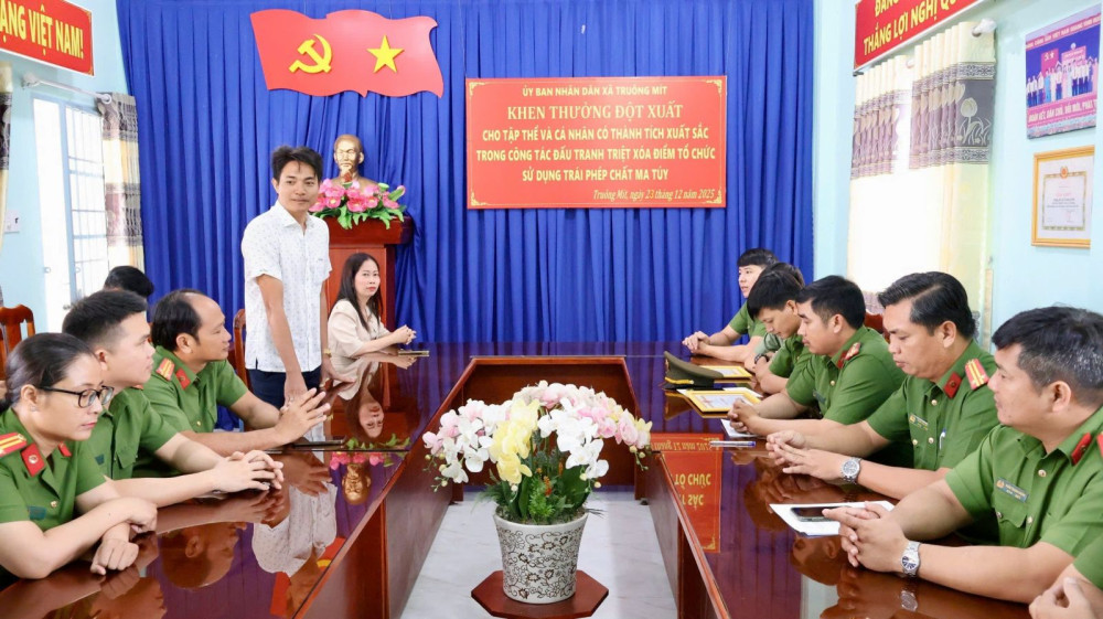 Sáng 23/12, UBND xã Truông Mít, tỉnh Tây Ninh, tổ chức lễ khen thưởng đột xuất nhằm kịp thời biểu dương, ghi nhận thành tích xuất sắc của tập thể và các cá nhân trong công tác đấu tranh triệt xóa điểm tổ chức sử dụng trái phép chất ma túy trên địa bàn xã.