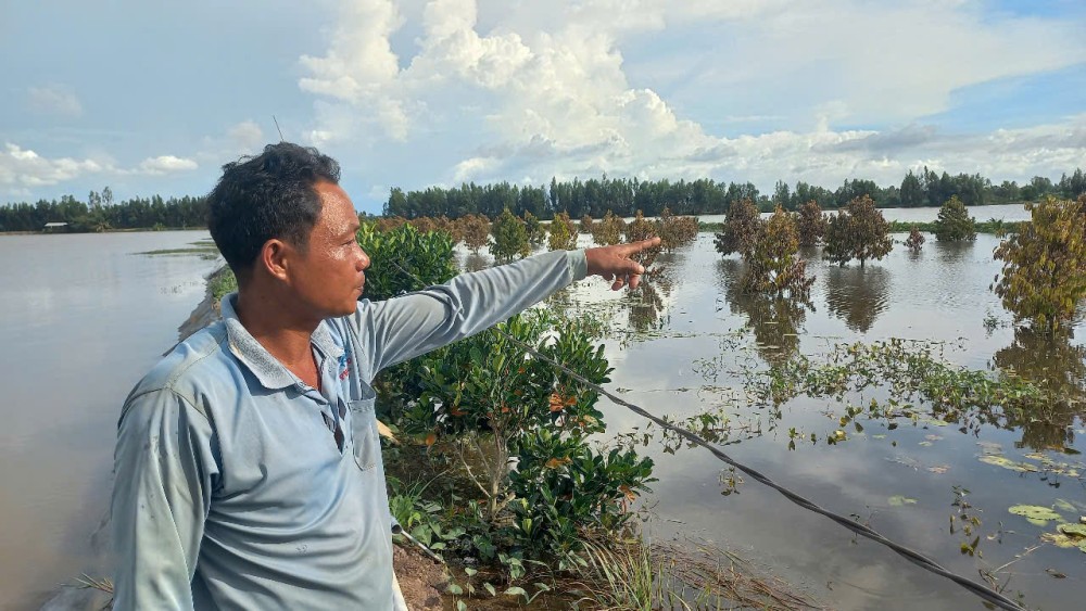 Anh Huỳnh Văn Hát (xã Vĩnh Thạnh) cho biết, mặc dù anh đã chủ động thuê nhân công gia cố đê bao bảo vệ vườn cây ăn trái của gia đình, nhưng do mực nước tăng nhanh, cách nay khoảng 1 tuần, đê bao bị vỡ, toàn bộ 1,6ha vườn cây ăn trái (sầu riêng, mít, dừa) của gia đình bị nước tràn vào, gây ngập úng toàn bộ.