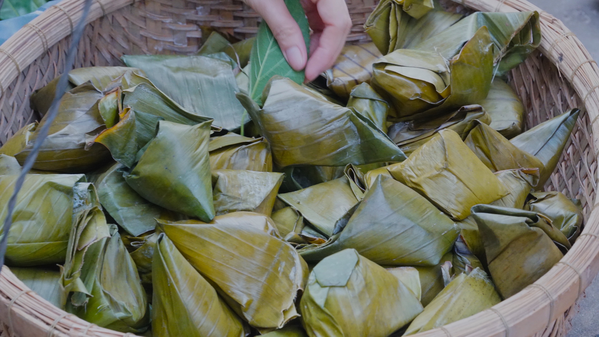 Thúng khoai, bánh ích... bán trong chợ đều được trả bằng lá cây.
