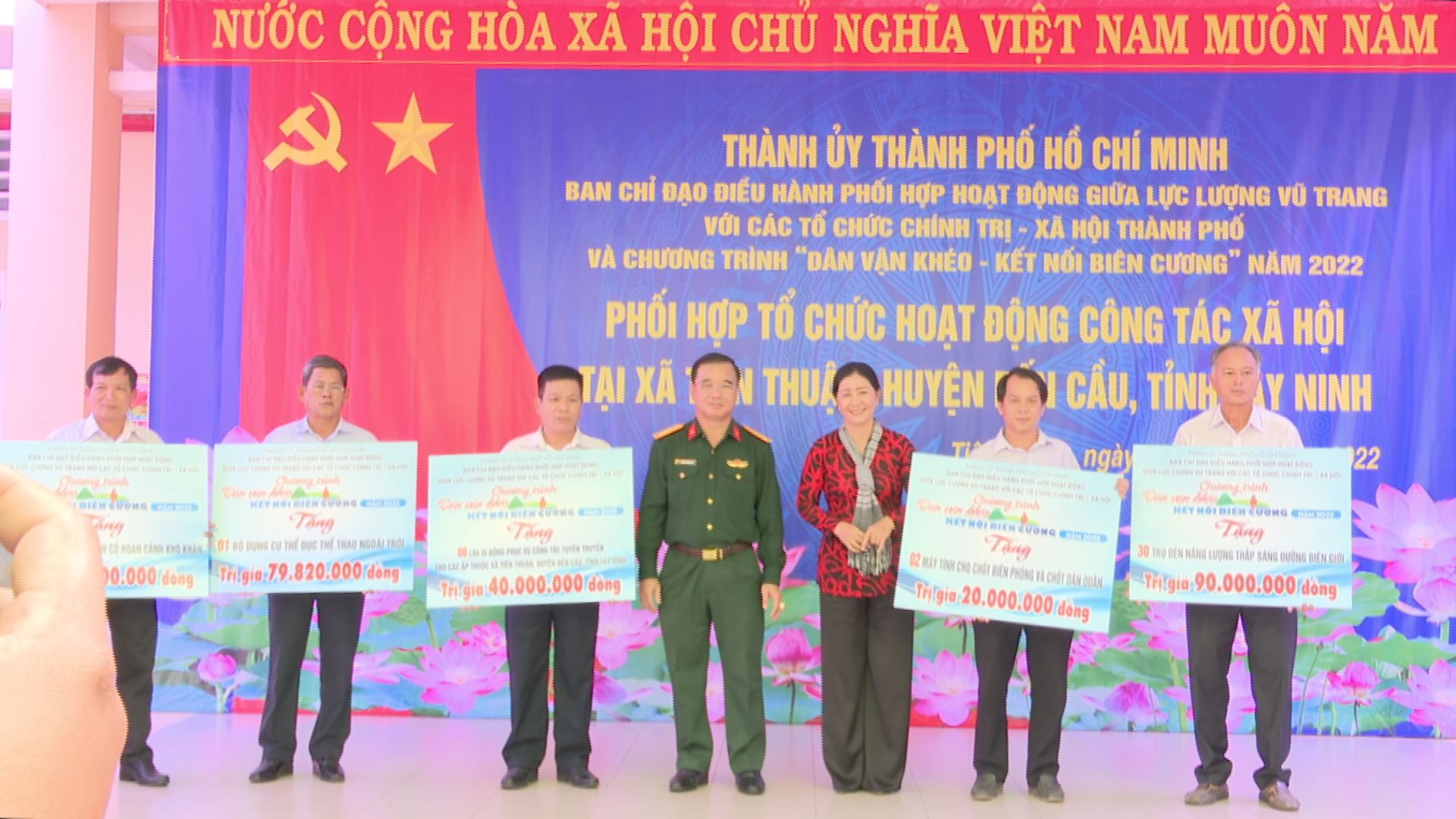 Tại chương trình, bà Nguyễn Thị Bạch Mai- Phó trưởng Ban Thường trực Ban Dân vận Thành uỷ Thành phố Hồ Chí Minh trao bảng tượng trưng 120.000.000 đồng kinh phí xây dựng nhà ở cho hộ nghèo, cận nghèo, hộ có hoàn cảnh khó khăn; 16 chiếc xe đạp tặng học sinh khó khăn có thành tích tốt trong học tập; 450 phần quà cho người có hoàn cảnh khó khăn, gia đình chính sách, gia đình có công, hộ nghèo, hộ cận nghèo, đối tượng bảo trợ; 8 loa di động phục vụ công tác tuyên truyền cho các ấp; 124 hộp vật dụng sơ cấp cứu cho 124 tổ dân cư tự quản; 10 cây đèn pin phục vụ công tác tuần tra trên tuyến biên giới; trao 20.000.000 đồng hỗ trợ xây dựng điểm dân quân liền kề Chốt dân quân Cầu Trắng.