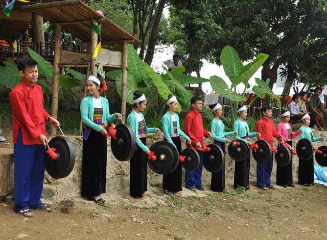 Những chàng trai, cô gái Mường ở bản Ngòi đánh cồng chiêng đón du khách.