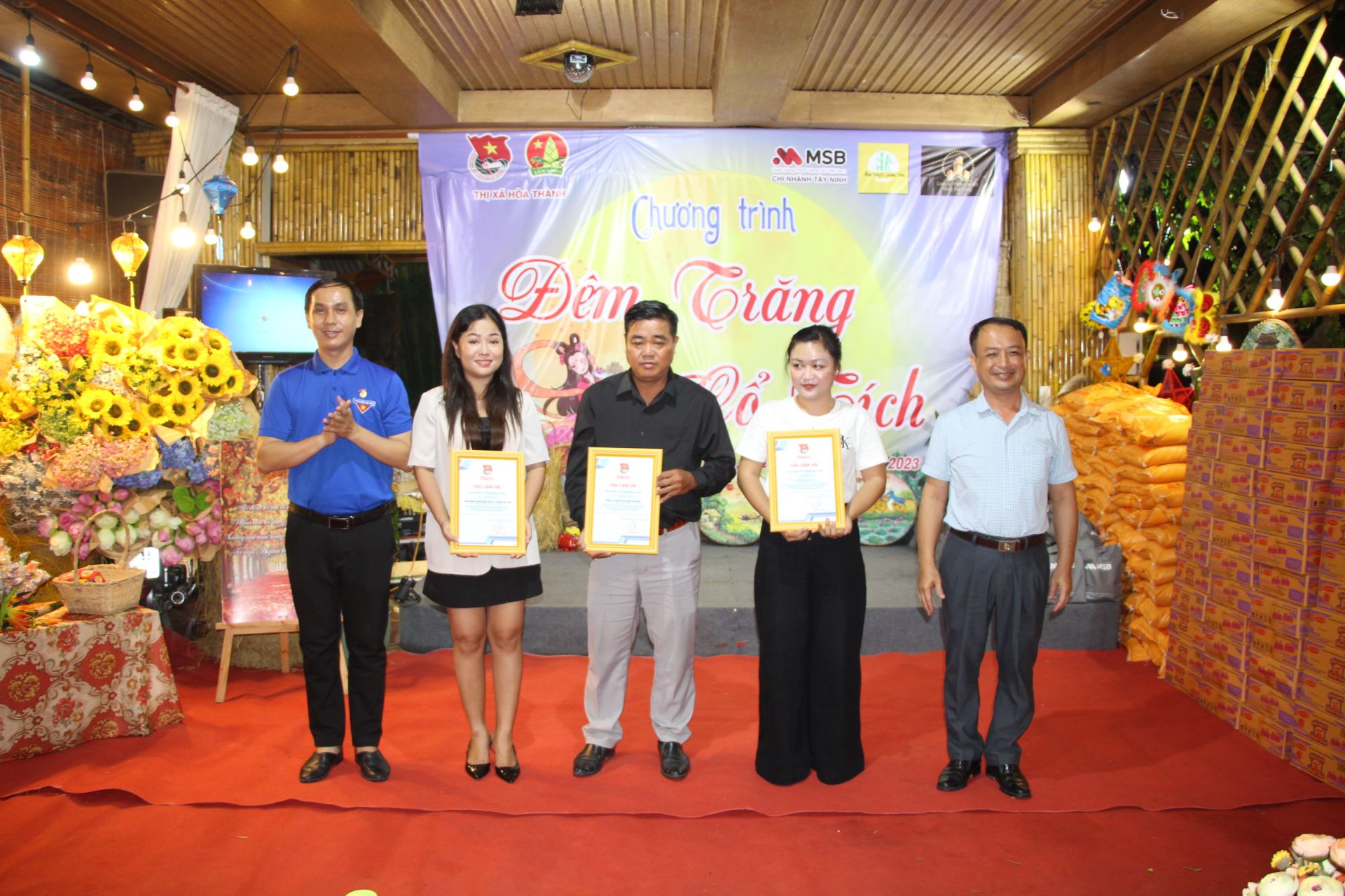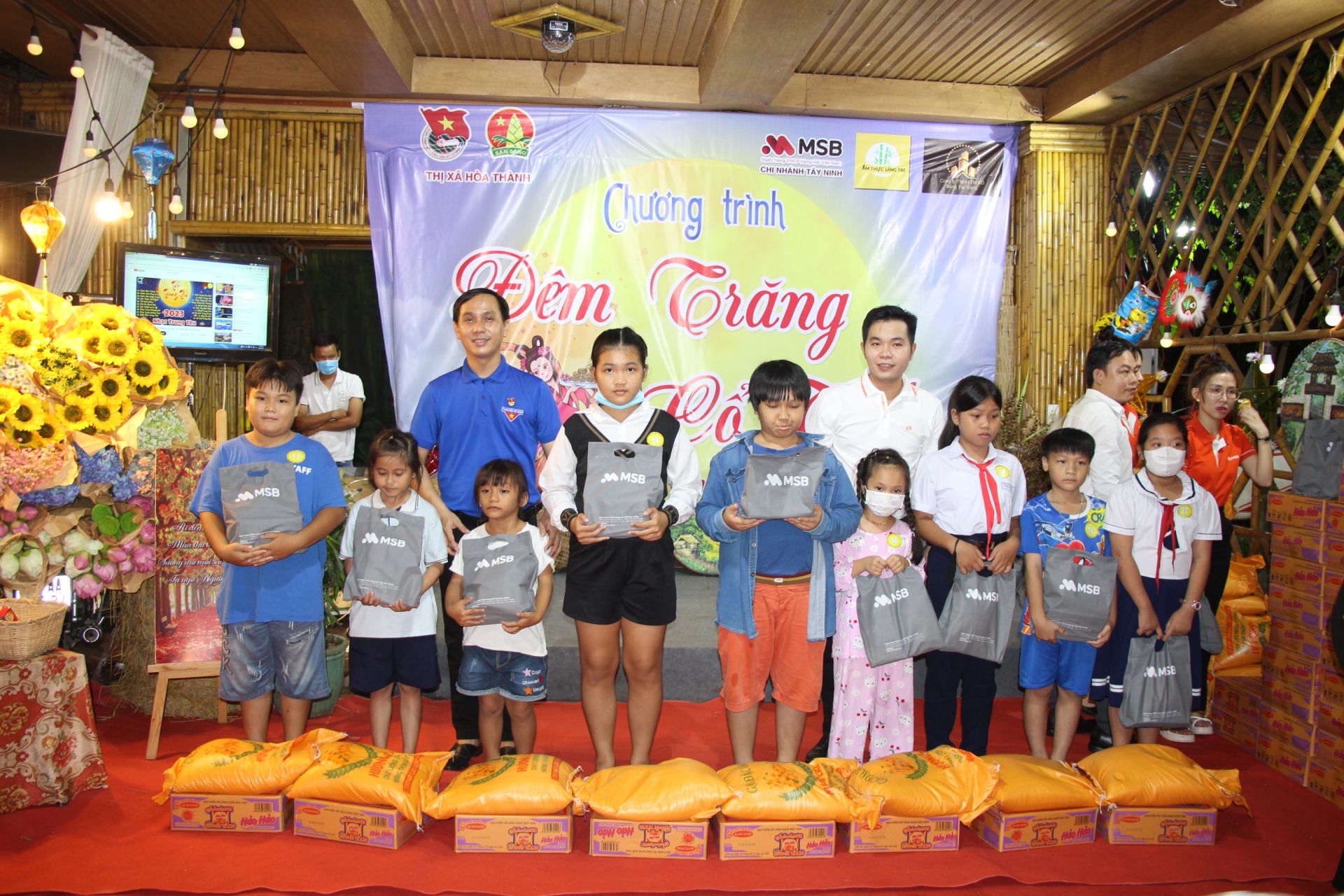 Tối 27.9, Thị đoàn Hoà Thành phối hợp Công đoàn Ngân hàng Hàng Hải chi nhánh Tây Ninh, Nhà hàng ẩm thực Làng Tre và Công ty TNHH thương mại xây dựng Sáng Tạo Vàng tổ chức chương trình trao quà tết Trung thu cho trẻ em có hoàn cảnh khó khăn với chủ đề “Đêm trăng cổ tích”.