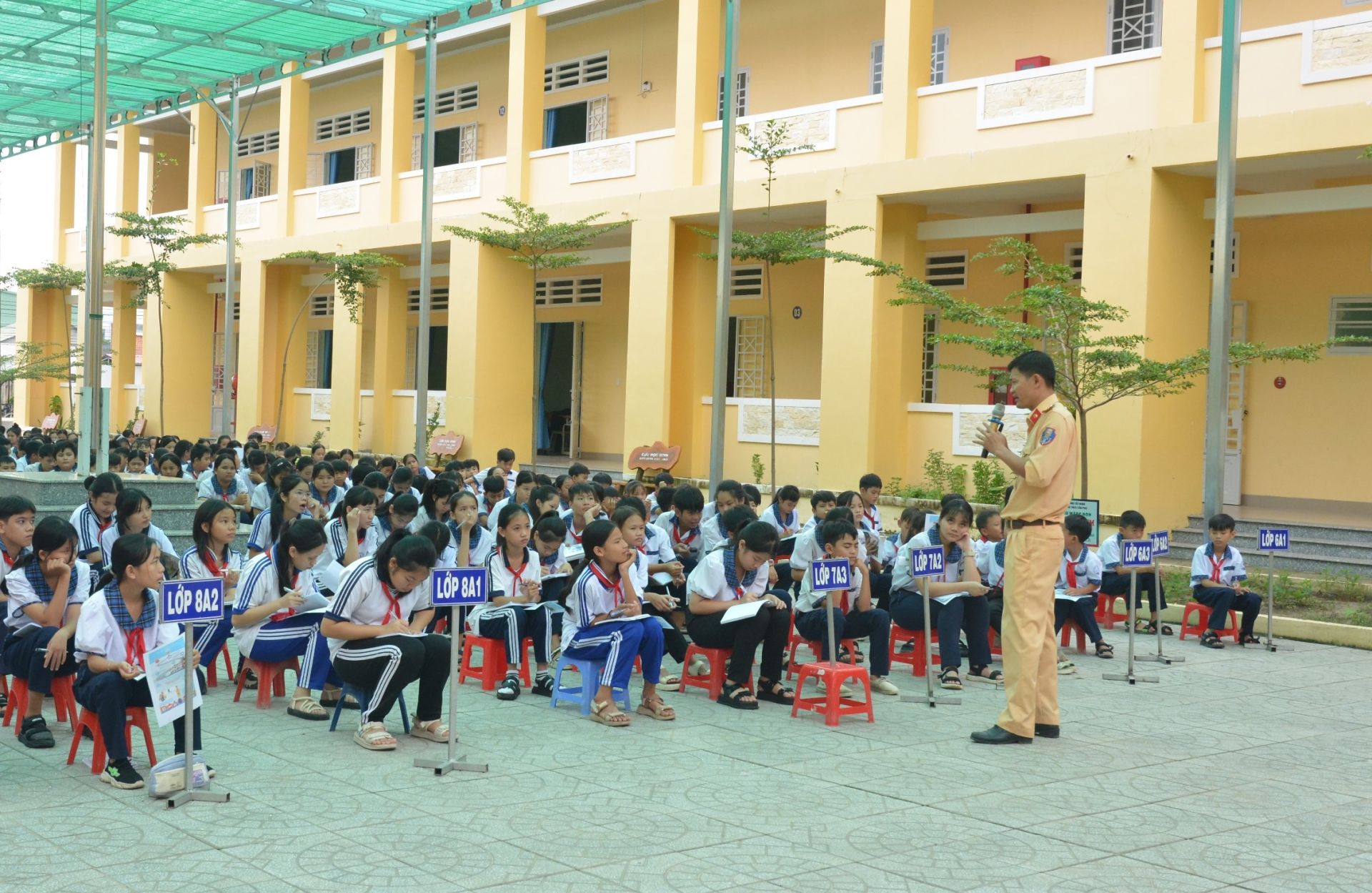 Trung tá Bùi Vũ Thanh Tài tuyên truyền về Luật Trật tự, an toàn giao thông đường bộ tại trường THCS Tân Phú.