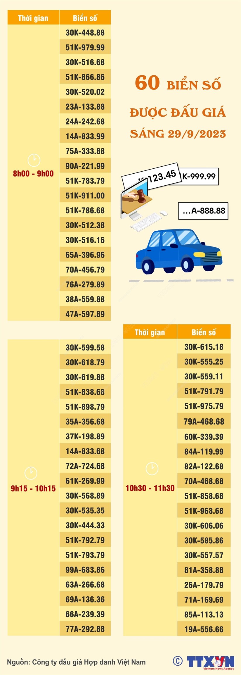 Công ty đấu giá Hợp danh Việt Nam đã công bố danh sách 60 biển số đẹp tiếp tục được đấu giá trực tuyến sáng ngày 29/9/2023.