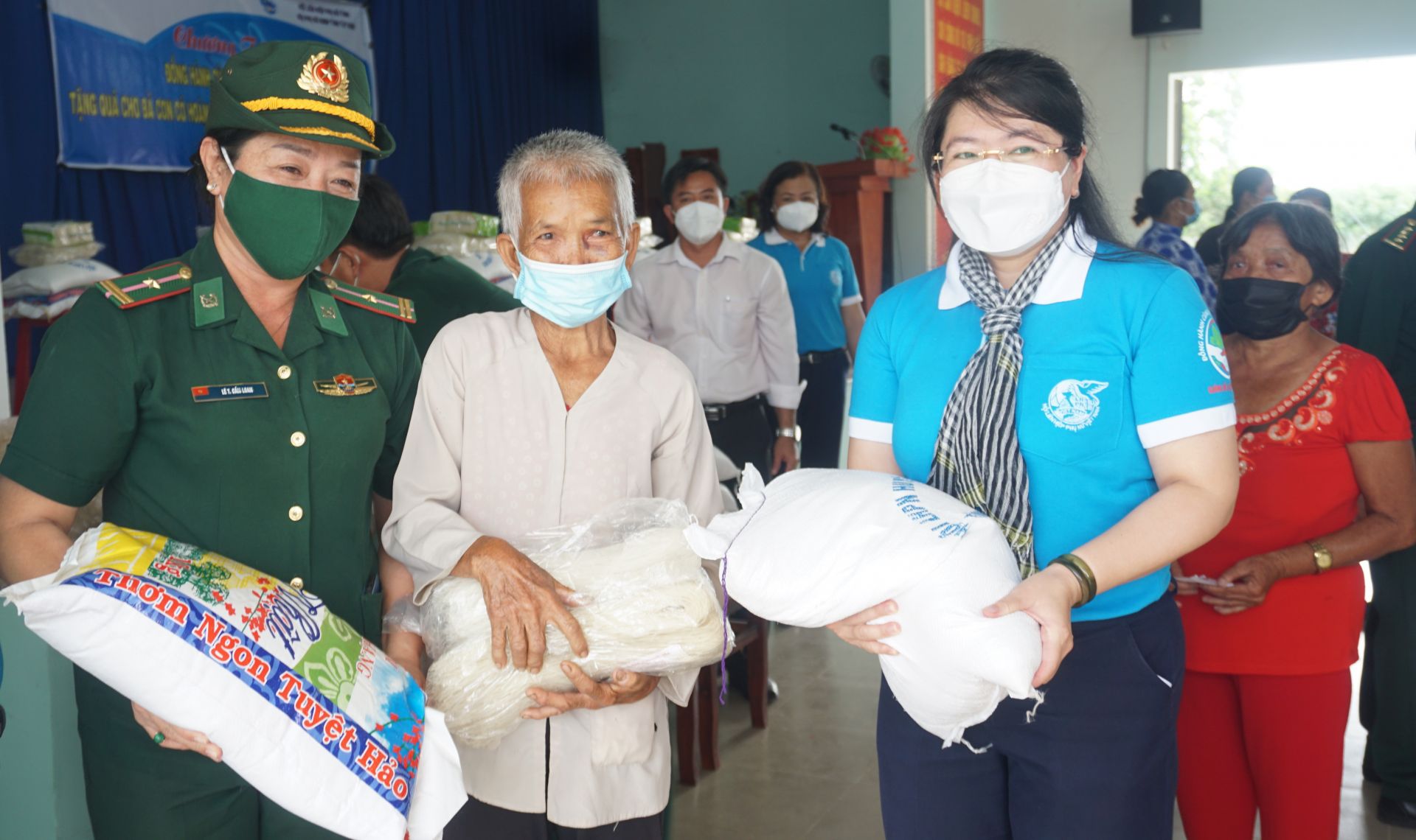 Bà Phan Thị Thuỳ Vân- Phó Chủ tịch phụ trách Hội LHPN tỉnh (bên phải) trao quà cho người dân xã Hoà Hội, huyện Châu Thành.
