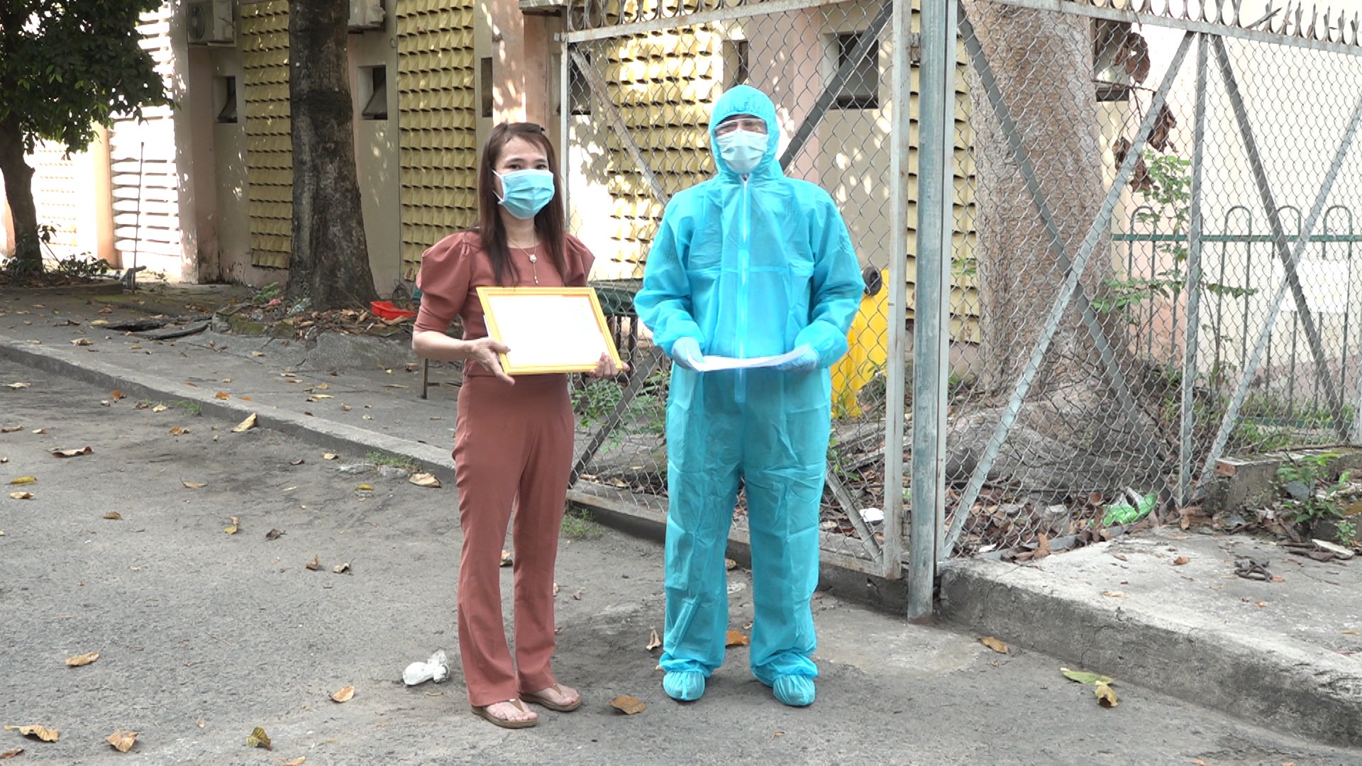 Ông Nguyễn Văn Tuấn- Giám đốc Trung tâm Y tế huyện Châu Thành trao tặng giấy khen và tiền thưởng cho chị X trong lúc cách ly. Ảnh: Gia Hân