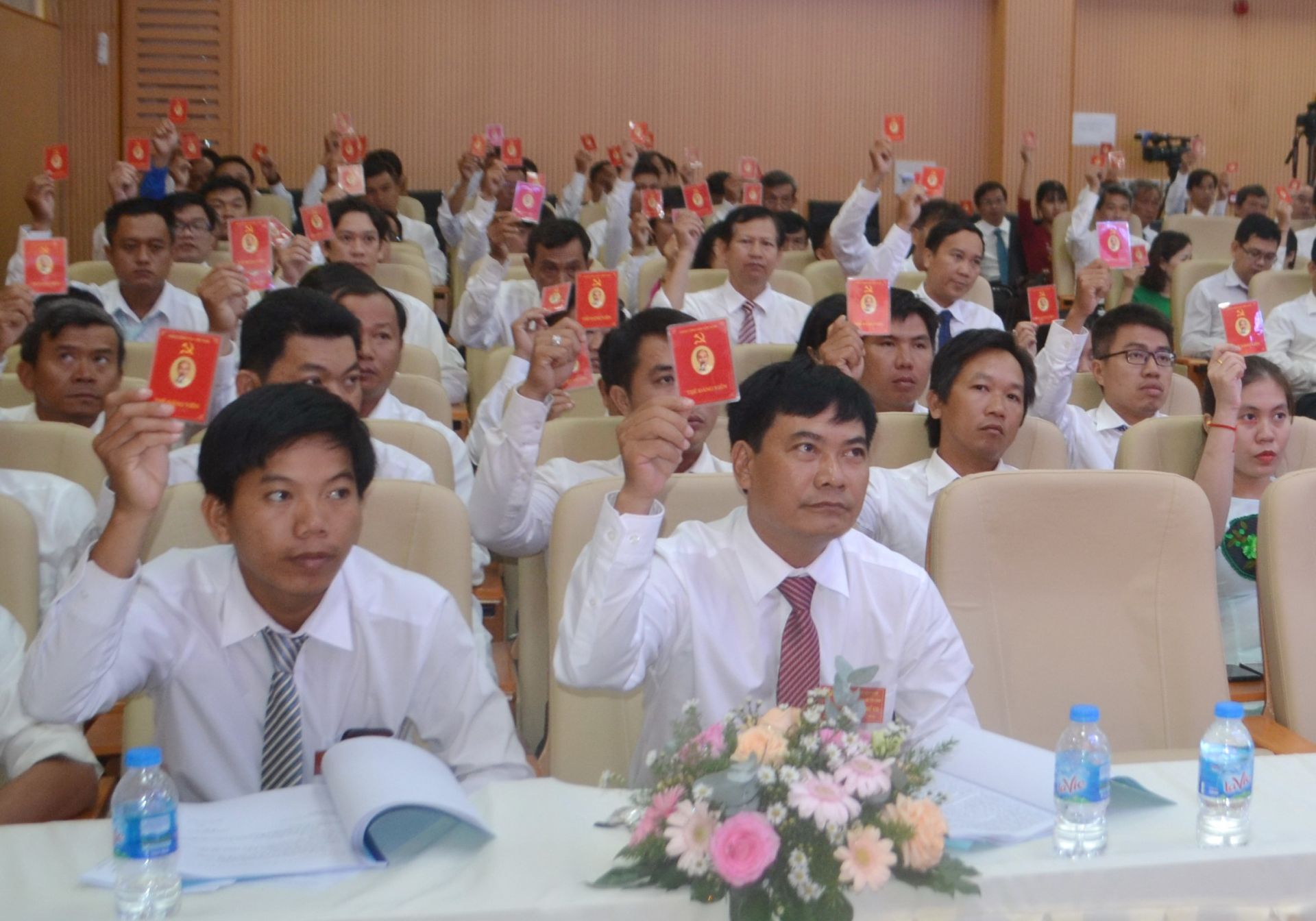 Đảng viên biểu quyết văn kiện tại đại hội cấp cơ sở Đảng bộ Công ty Điện lực Tây Ninh.