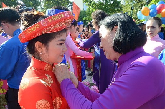 Phó Chủ tịch HĐND TPHCM Trương Thị Ánh chúc mừng hạnh phúc những đôi vợ chồng trẻ trong ngày cưới.