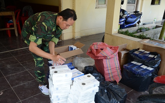 Khi lập biên bản tạm giữ phương tiện và tang vật, các chiến sĩ biên phòng phát hiện bên trong bao tải có chứa 1.000 gói thuốc lá ngoại nhãn hiệu 555.
