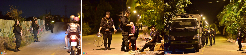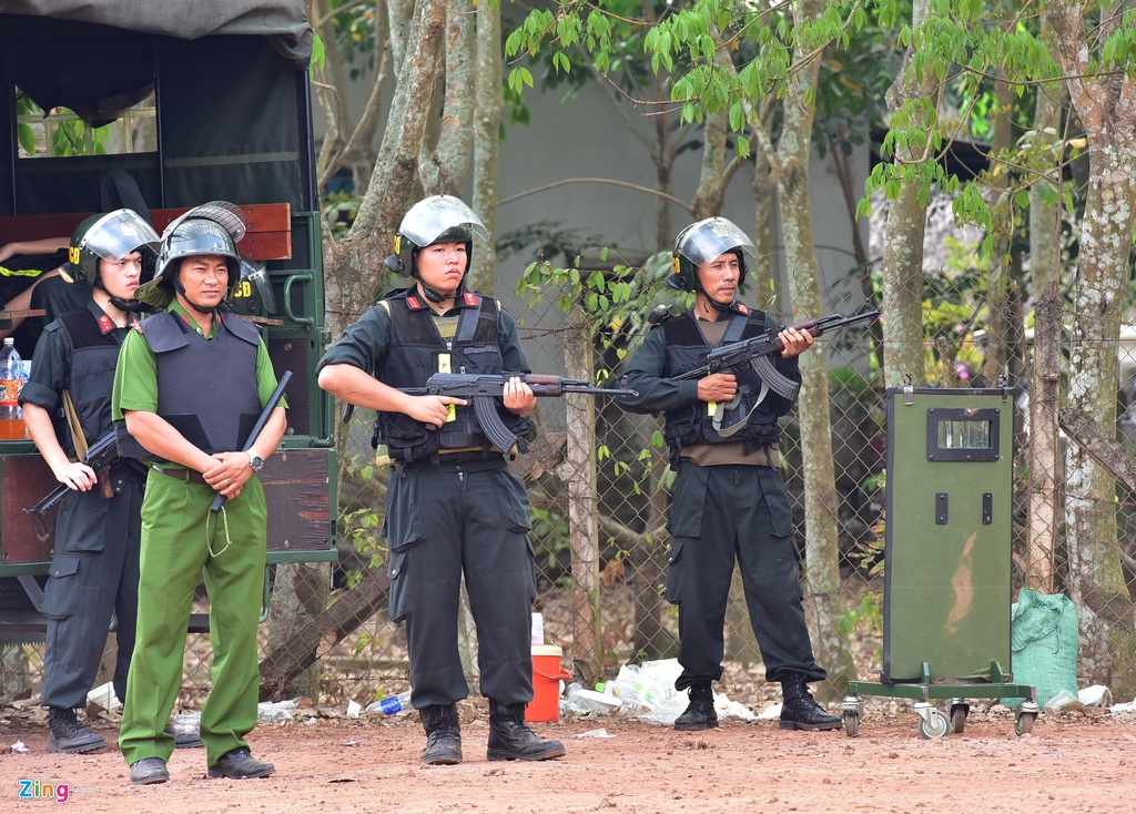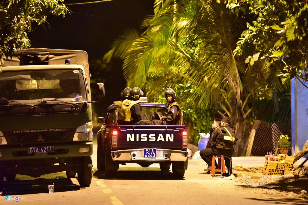 Hàng chục chiếc xe chở cảnh sát cơ động vào ra liên tục ở khu vực vây bắt. Khuya 30/1, từng tốp cảnh sát vẫn đứng dọc đường Trung An, một số cảnh sát còn ẩn nấp ở bụi cây, bờ ruộng để sẵn sàng tiếp cận mục tiêu.