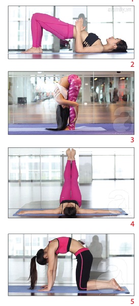 - Thở ra và nâng hông lên khỏi mặt đất. Đầu gối và bàn chân tạo thành một đường thẳng vuông góc với sàn. Khép chặt khuỷu tay. Đưa cánh tay dựng thẳng giữ hờ hai bên eo.
