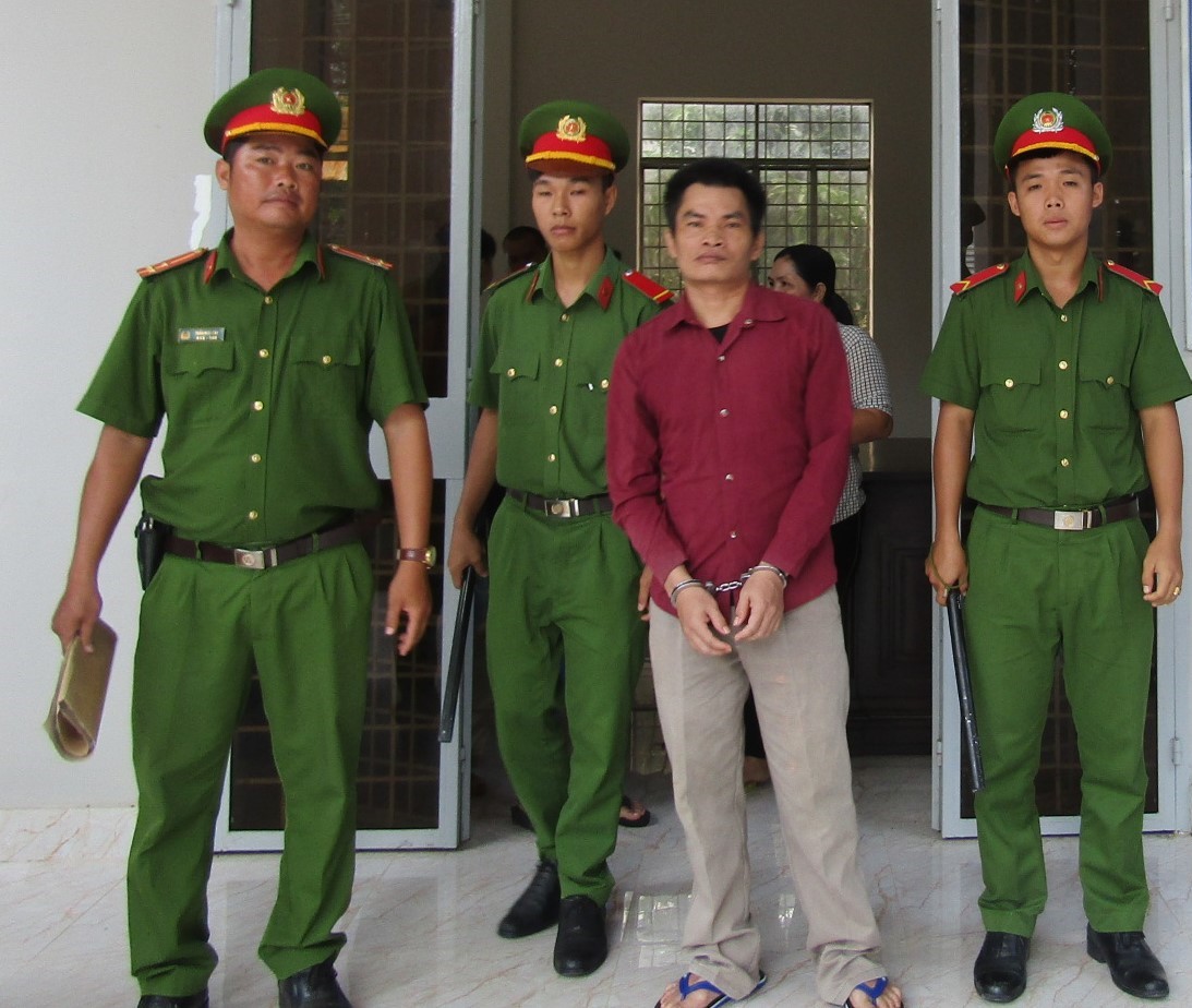 Công an dẫn giải Huỳnh Thuận Hòa từ phòng xử án ra xe công vụ.