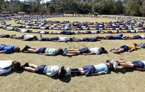 541 sinh viên của trường Hillcrest Christian (Úc) đã đổ ra sân trường, nằm úp mặt xuống đất và đặt hai tay đặt cạnh sườn.