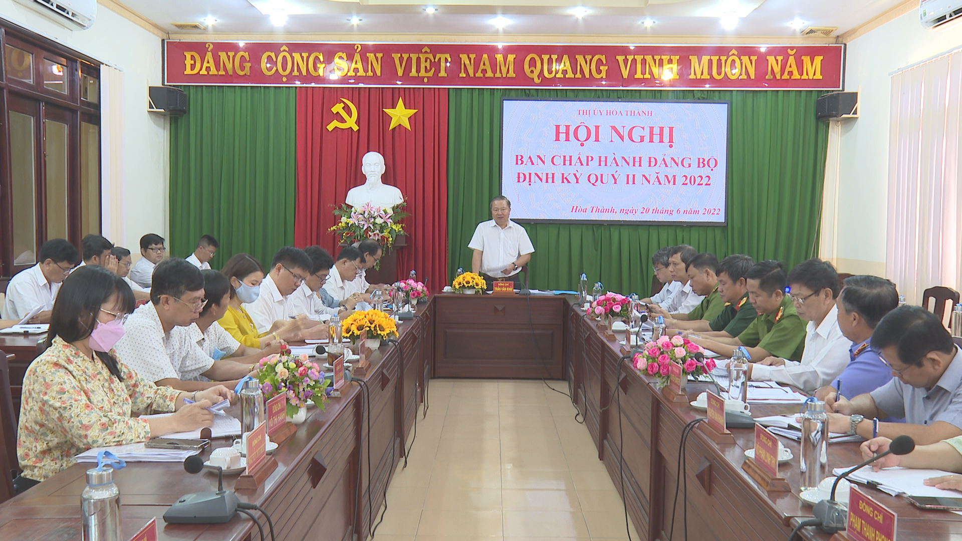 Sáng 20.6, Thị uỷ Hoà Thành tổ chức hội nghị Ban Chấp hành Đảng bộ định kỳ quý II.2022 đánh giá tình hình thực hiện nhiệm vụ chính trị 6 tháng đầu năm 2022. Bí thư Thị uỷ Hoà Thành Trần Văn Khải chủ trì hội nghị.