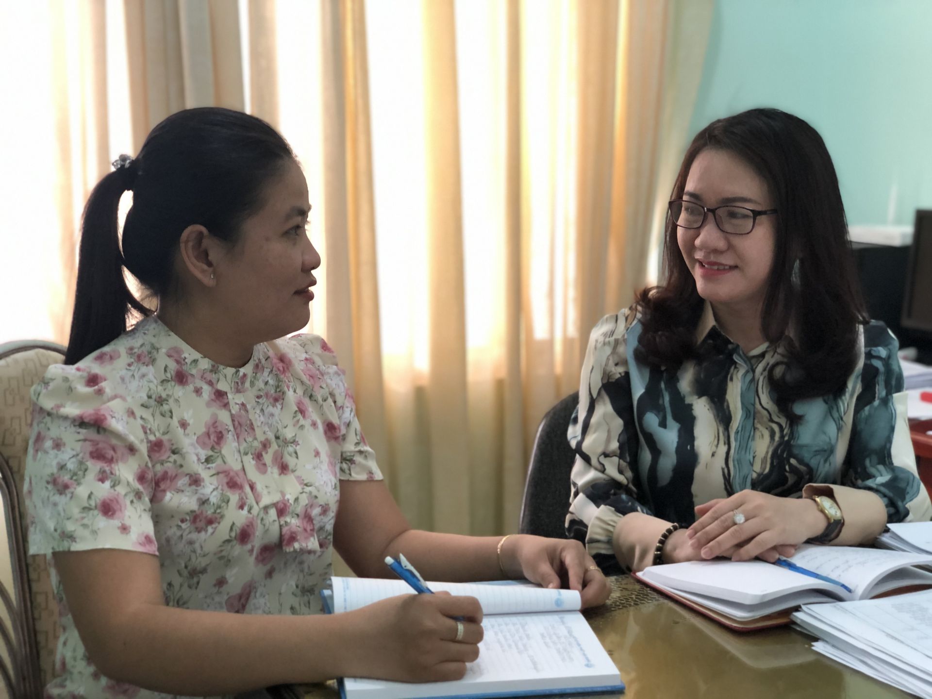 Bà Nguyễn Thị Thanh Sơn – Bí thư Đảng uỷ xã Trí Bình (bên phải) trao đổi công việc với Chủ tịch Hội LHPN xã Nguyễn Thị Dạ Thảo.