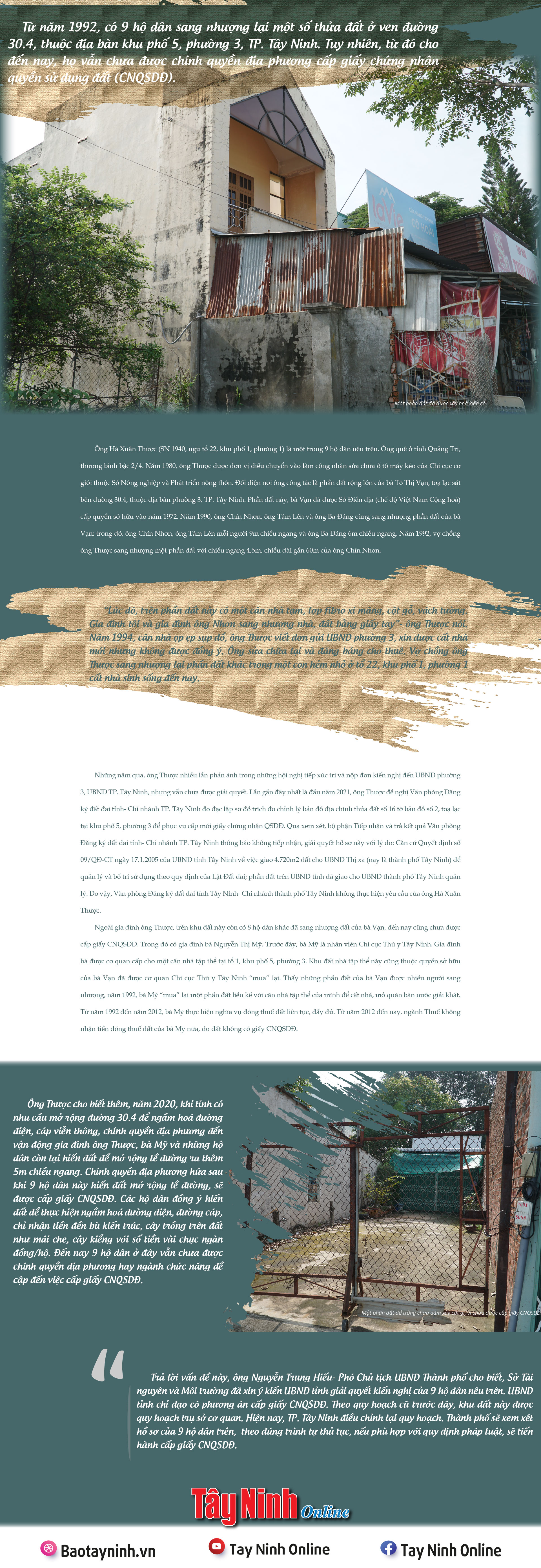 Từ năm 1992, có 9 hộ dân sang nhượng lại một số thửa đất ở ven đường 30.4, thuộc địa bàn khu phố 5, phường 3, TP. Tây Ninh. Tuy nhiên, từ đó cho đến nay, họ vẫn chưa được chính quyền địa phương cấp giấy chứng nhận quyền sử dụng đất (CNQSDĐ). |