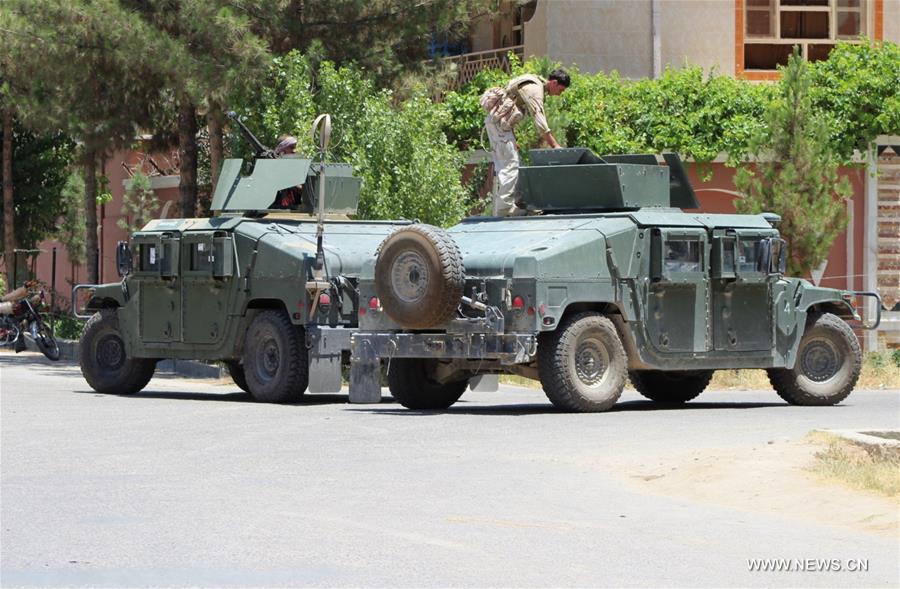 Một thành viên an ninh Afghanistan đứng trên một xe quân sự tại hiện trường vụ tấn công ở tỉnh Helmand, Afghanistan hôm 22.6. Ảnh: THX |