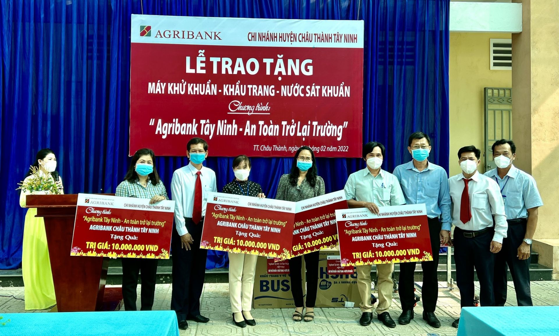Riêng tại Châu Thành, Agribank Tây Ninh trao tặng cho 4 điểm trường gồm: Trường THCS Thị trấn, Trường THCS An cơ, Trường tiểu học Thị trấn A và Trường tiểu học Ngô Thất Sơn. Mỗi trường 2 máy sát khuẩn tay tự động; 85 hộp khẩu trang y tế và 15 lít nước sát khuẩn, tổng trị giá 40 triệu đồng.