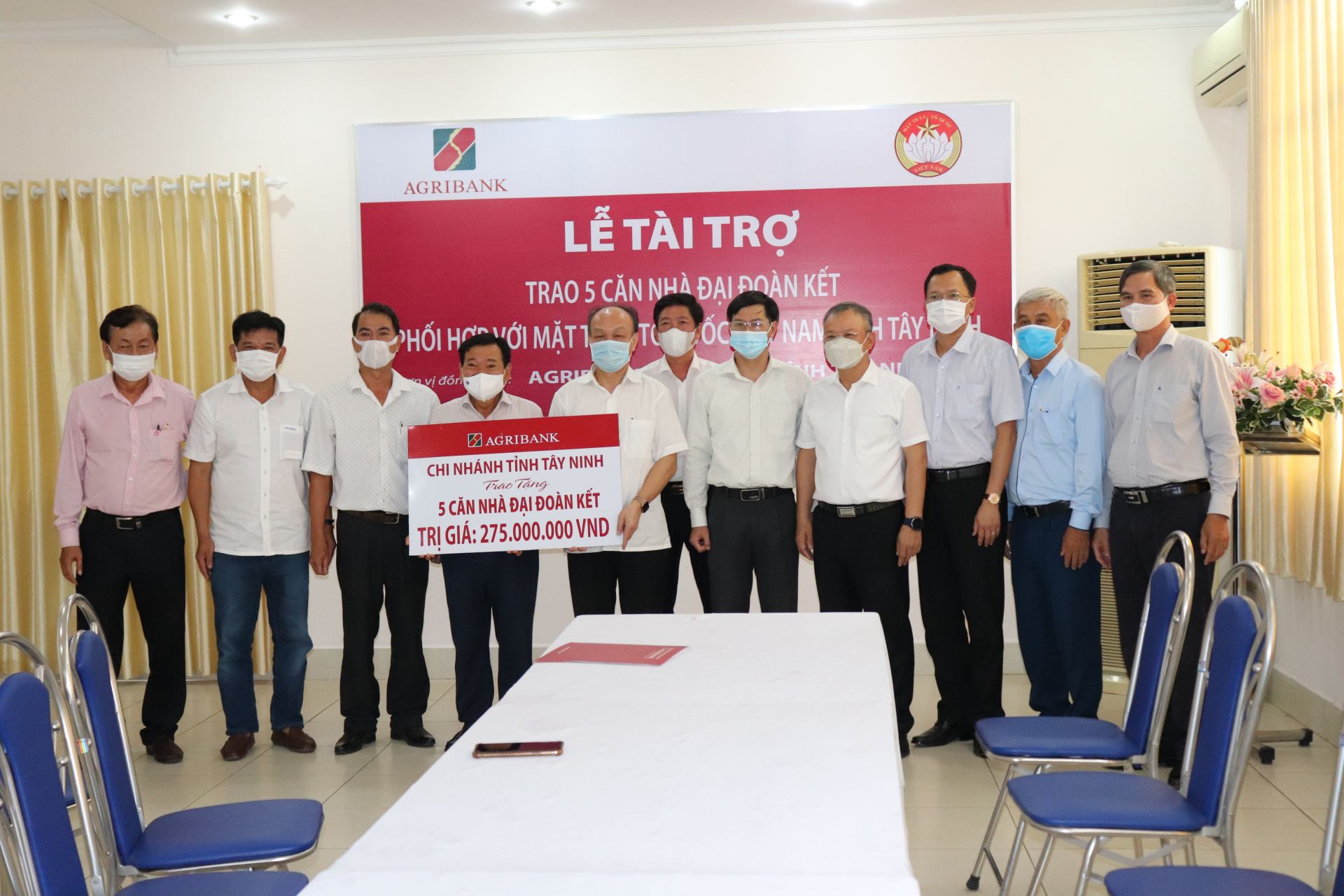 Chiều 7.5, Ngân hàng Nông nghiệp và Phát triển nông thôn (Agribank) chi nhánh Tây Ninh phối hợp với UB.MTTQ Việt Nam tỉnh tổ chức lễ tài trợ 5 căn nhà đại đoàn kết với tổng trị giá 275 triệu đồng tại TP. Tây Ninh, thị xã Hoà Thành và các huyện Tân Châu, Tân Biên, Dương Minh Châu.