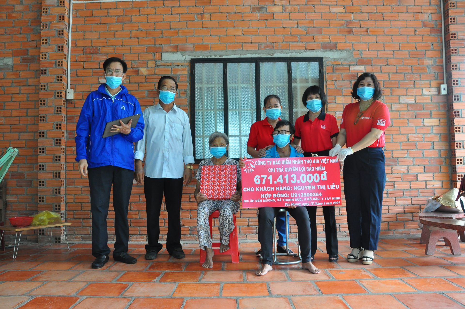 Ngày 15.9, tại ấp Bến Mương, xã Thạnh Đức, huyện Gò Dầu, Công ty TNHH Bảo hiểm nhân thọ AIA Việt Nam chi nhánh Tây Ninh tổ chức chi trả quyền lợi hợp đồng bảo hiểm cho khách hàng Nguyễn Thị Liễu.