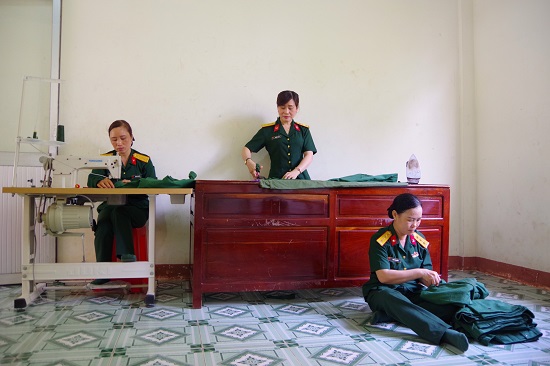 Tổ công tác Hội phụ nữ Trung đoàn đang tổ chức chỉnh sửa quân trang cho bộ đội.