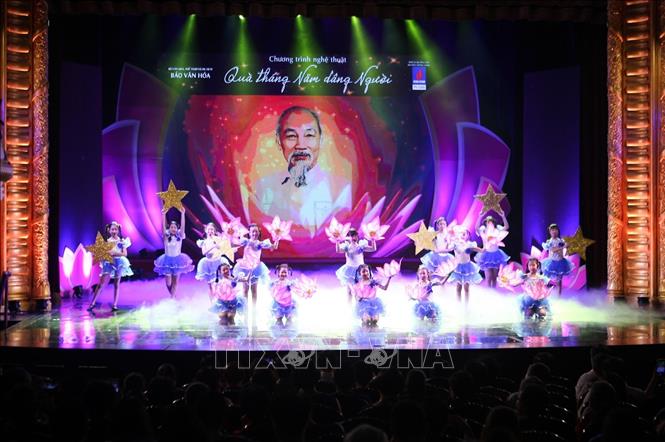 Các em thiếu nhi biểu diễn liên khúc Bác Hồ người cho em tất cả - Ca ngợi Tổ quốc trong Chương trình nghệ thuật "Quà tháng Năm dâng Người". Ảnh: Thanh Tùng/TTXVN