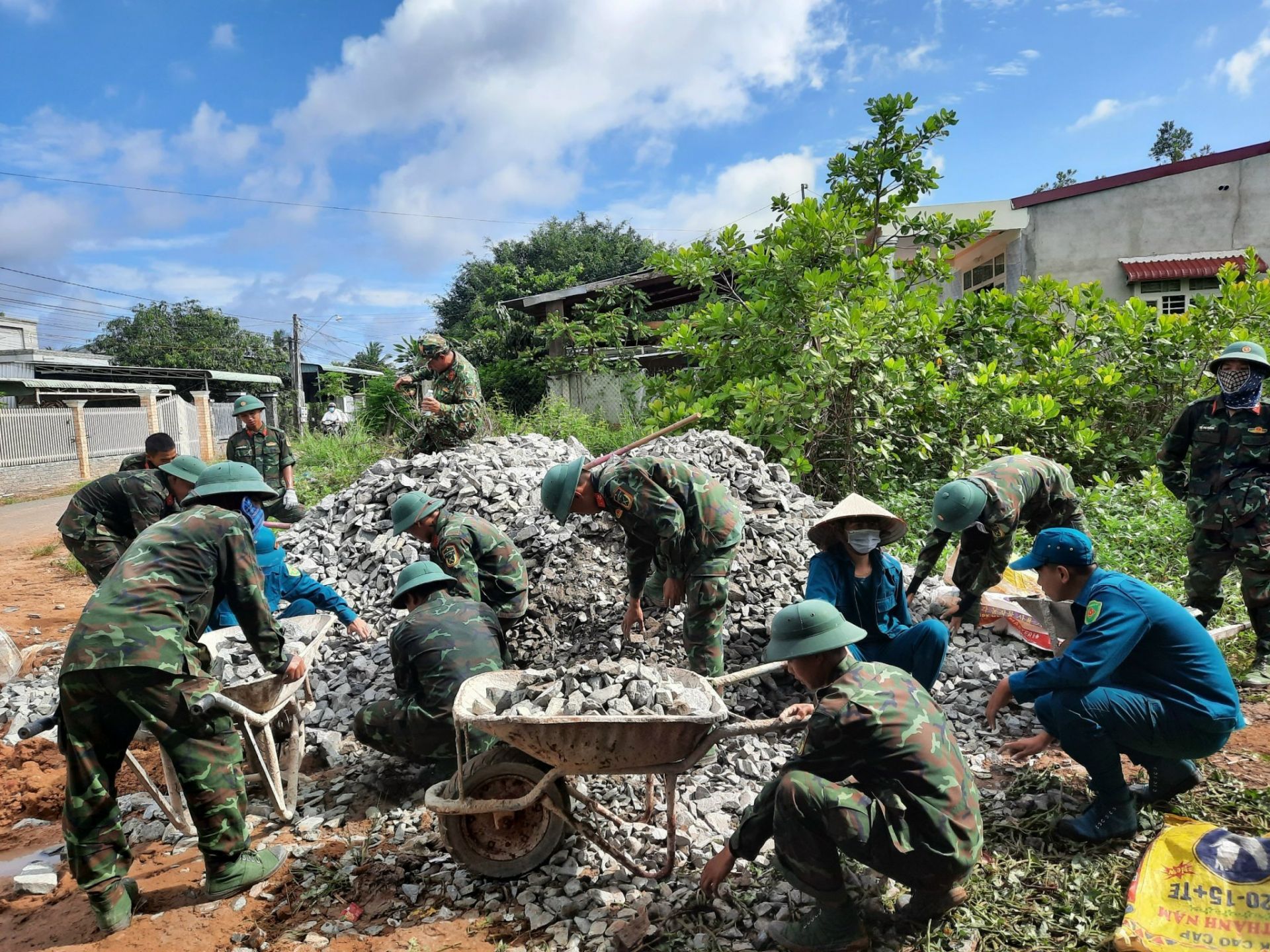 CBCS Sư đoàn 5 cùng nhân dân ấp Tân Hòa khuân đá thi công tuyến đường tố 13 ấp Tân Hoà xã Tân Lập, huyện Tân Biên (ảnh Duy Phú)