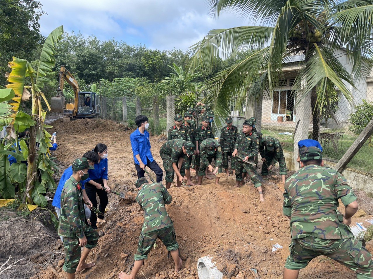 Đại đội BB105 cùng ĐVTN thi công cống thoát nước tại tổ 10 ấp Thạnh Trung xã Thạnh Tây, huyện Tân Biên (ảnh Duy Phú)