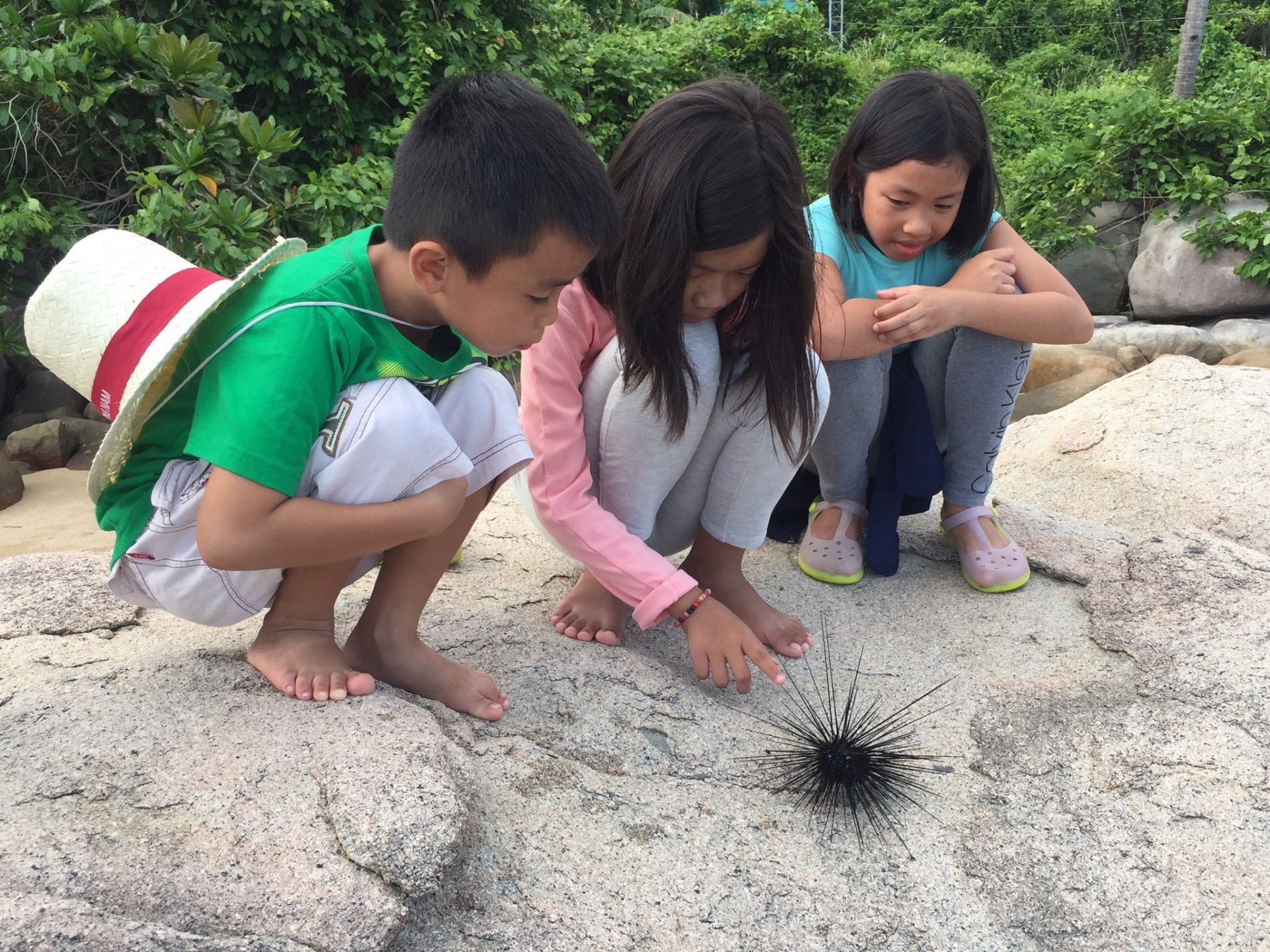 Những du khách nhí thích thú khi bắt được nhum- một loài hải sản ở hòn Sơn.