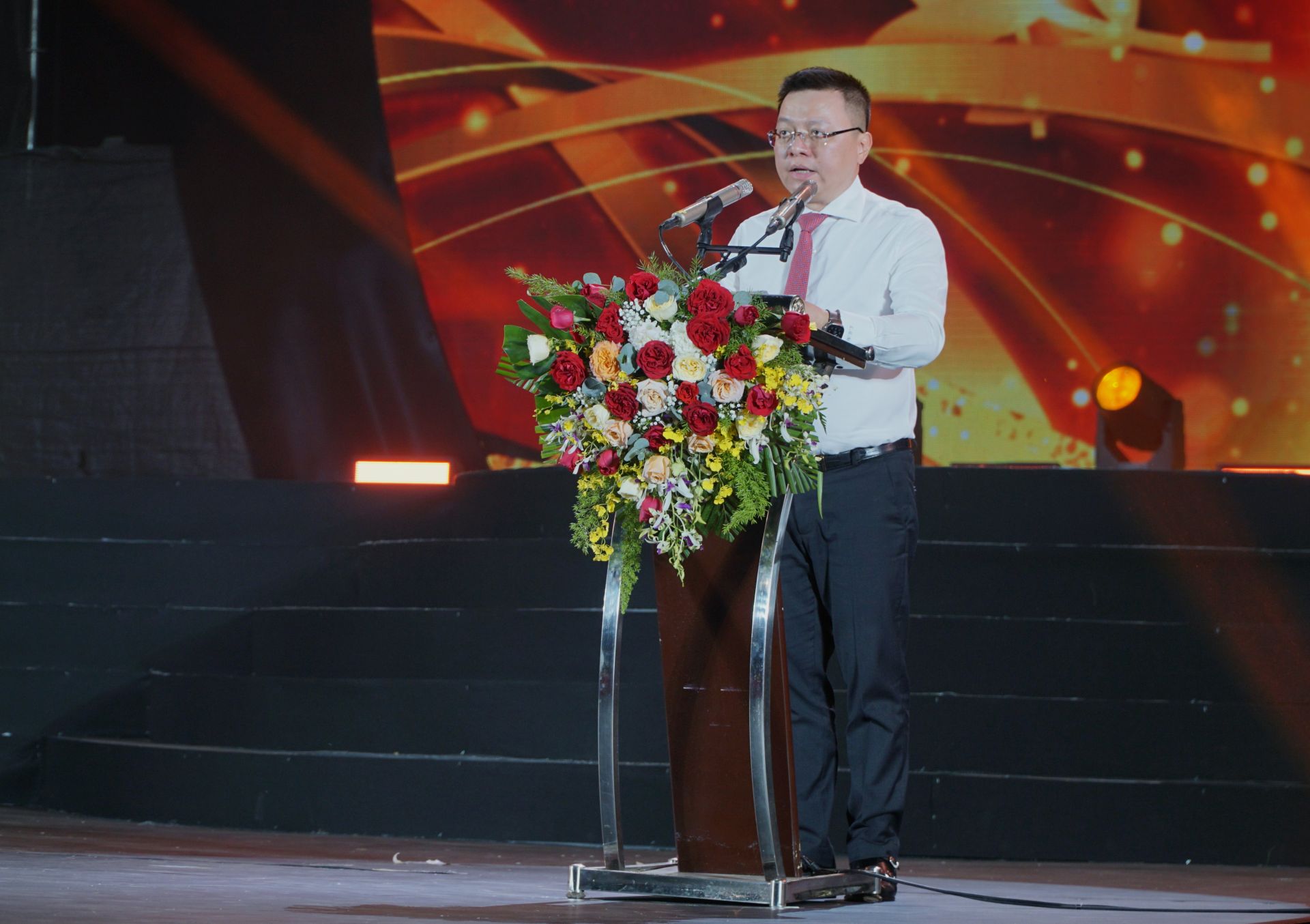 Tổng Biên tập Báo Nhân Dân Lê Quốc Minh phát biểu tại Lễ khai mạc chương trình nghệ thuật chính luận “Tây Ninh - Khúc hát tự hào”.