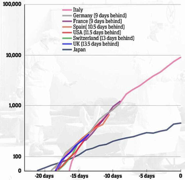 Anh cho đến nay không thực hiện bất kỳ biện pháp quyết liệt nào để ngăn virus lây lan, trong khi giới chức bày tỏ tin tưởng rằng họ có thể ngăn chặn dịch bệnh. Tuy nhiên, giáo sư Mark Handley thuộc Đại học London đã xây dựng một biểu đồ cho thấy Covid-19 ở Anh, Đức, Pháp, Tây Ban Nha, Mỹ và Thụy Sĩ đều đang đi theo cùng một quỹ đạo như Italy. Các quốc gia này đều chứng kiến mức tăng ca nhiễm mới hàng ngày khoảng 33%.