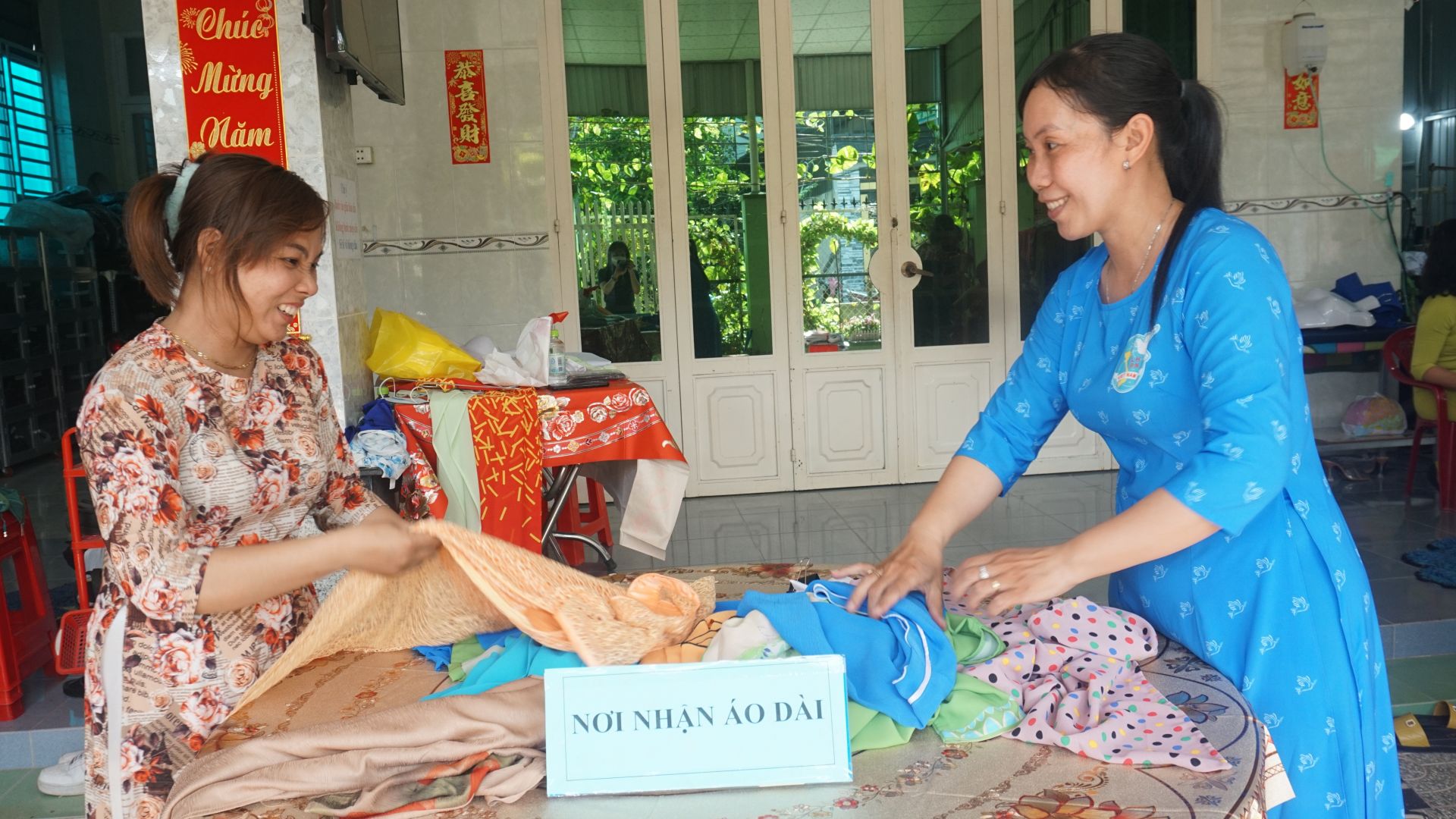 Chị Tô Thị Linh Thảo - Phó chủ tịch Hội LHPN xã Bàu Năng (phải) tiếp nhận áo dài từ hội viên.