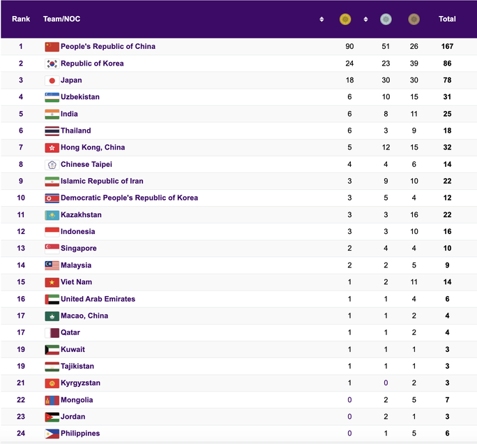 Với 1 HCV, 1 HCB và 2 HCĐ giành được trong ngày, đoàn TTVN từ vị trí thứ 22 đã vượt lên 7 bậc, xếp hạng 15 trên bảng tổng sắp huy chương tạm thời ASIAD 19 (1 HCV, 2 HCB, 11 HCĐ).
