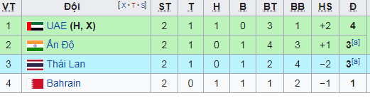 Ấn Độ tạm xếp thứ 2 với 3 điểm sau 1 trận thắng, 1 trận hòa và hiệu số +1. Kế tiếp là Thái Lan cũng có 3 điểm nhưng hiệu số là -2. Còn Bahrain với 1 trận hòa, hiệu số -1, tạm xếp cuối bảng.