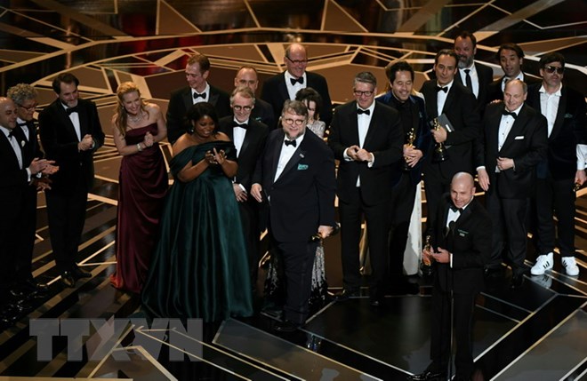 Đạo diễn Guillermo del Toro (giữa) cùng các diễn viên và đoàn làm phim "The Shape of Water" nhận giải thưởng danh giá "Phim điện ảnh xuất sắc nhất" tại Lễ trao giải Oscar 2018. (Ảnh: AFP-TTXVN)