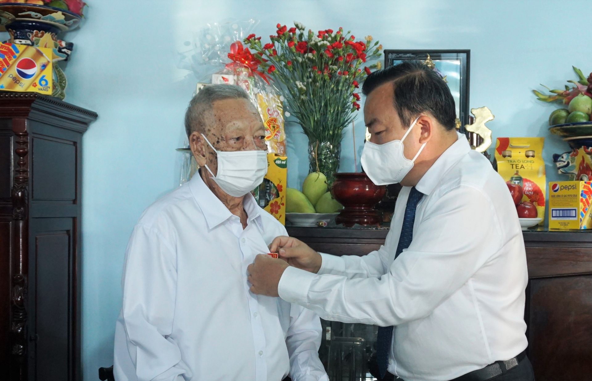 Phó Bí thư Thường trực Tỉnh ủy Phạm Hùng Thái gắn huy hiệu 75 năm tuổi Đảng cho đảng viên Lê Văn A.