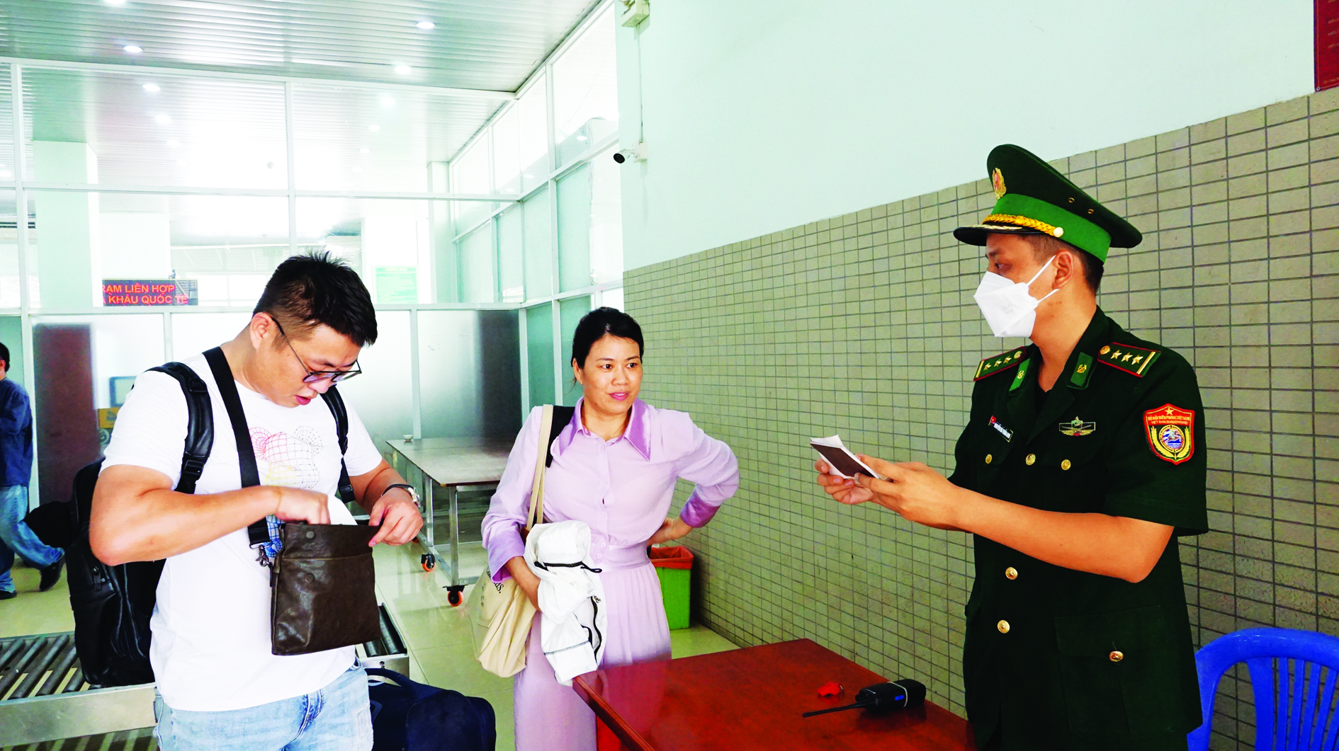 Lực lượng Đồn Biên phòng Cửa khẩu quốc tế Mộc Bài kiểm tra giấy tờ của hành khách.