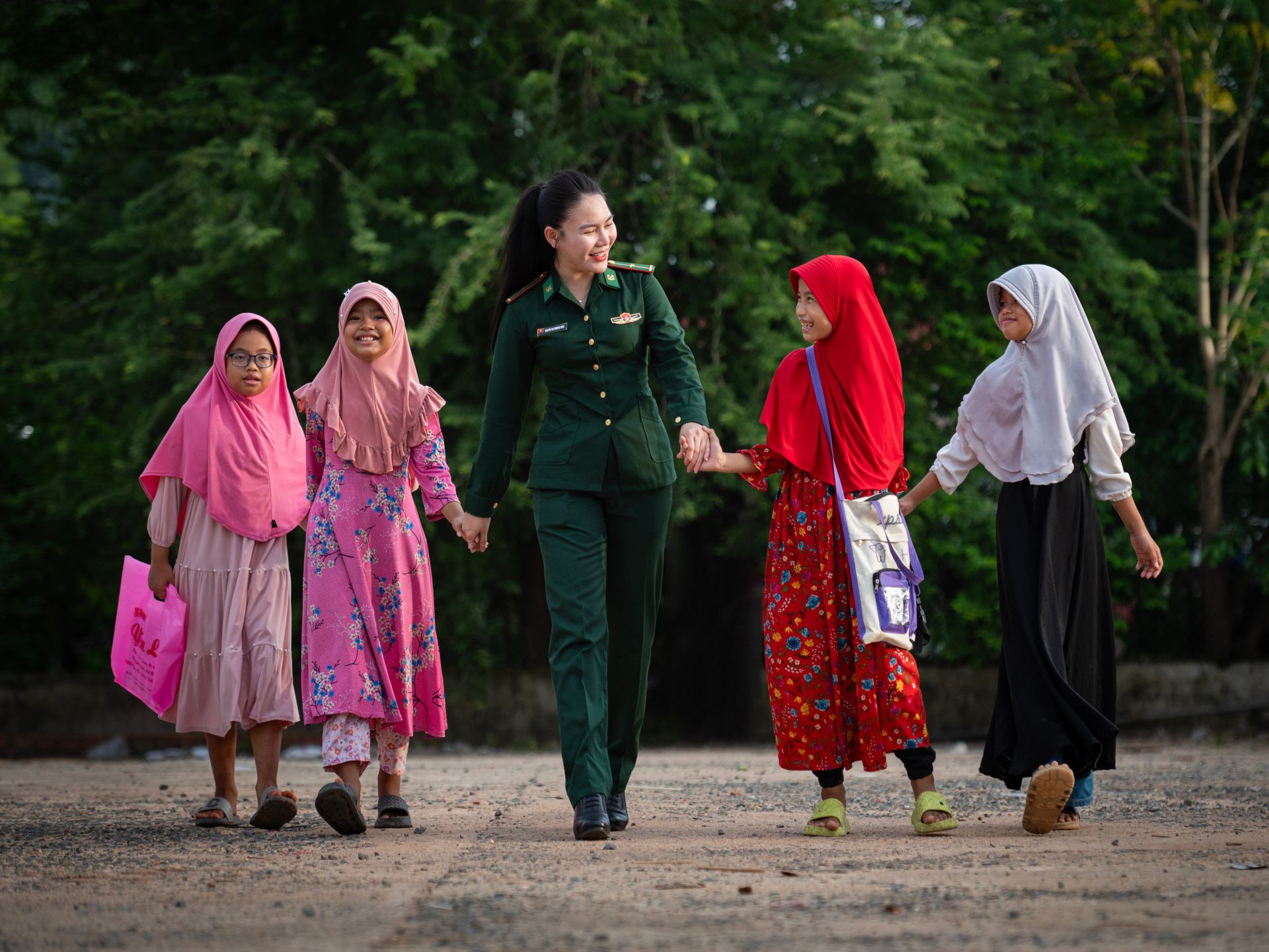 Nữ chiến sĩ Biên phòng và trẻ em dân tộc Chăm. Ảnh Dương Đức Kiên