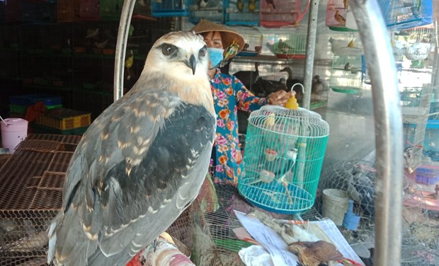 Các loài chim hoang dã được bày bán công khai tại chợ Thạnh Hóa, tỉnh Long An. (Ảnh: HV/Vietnam+)
