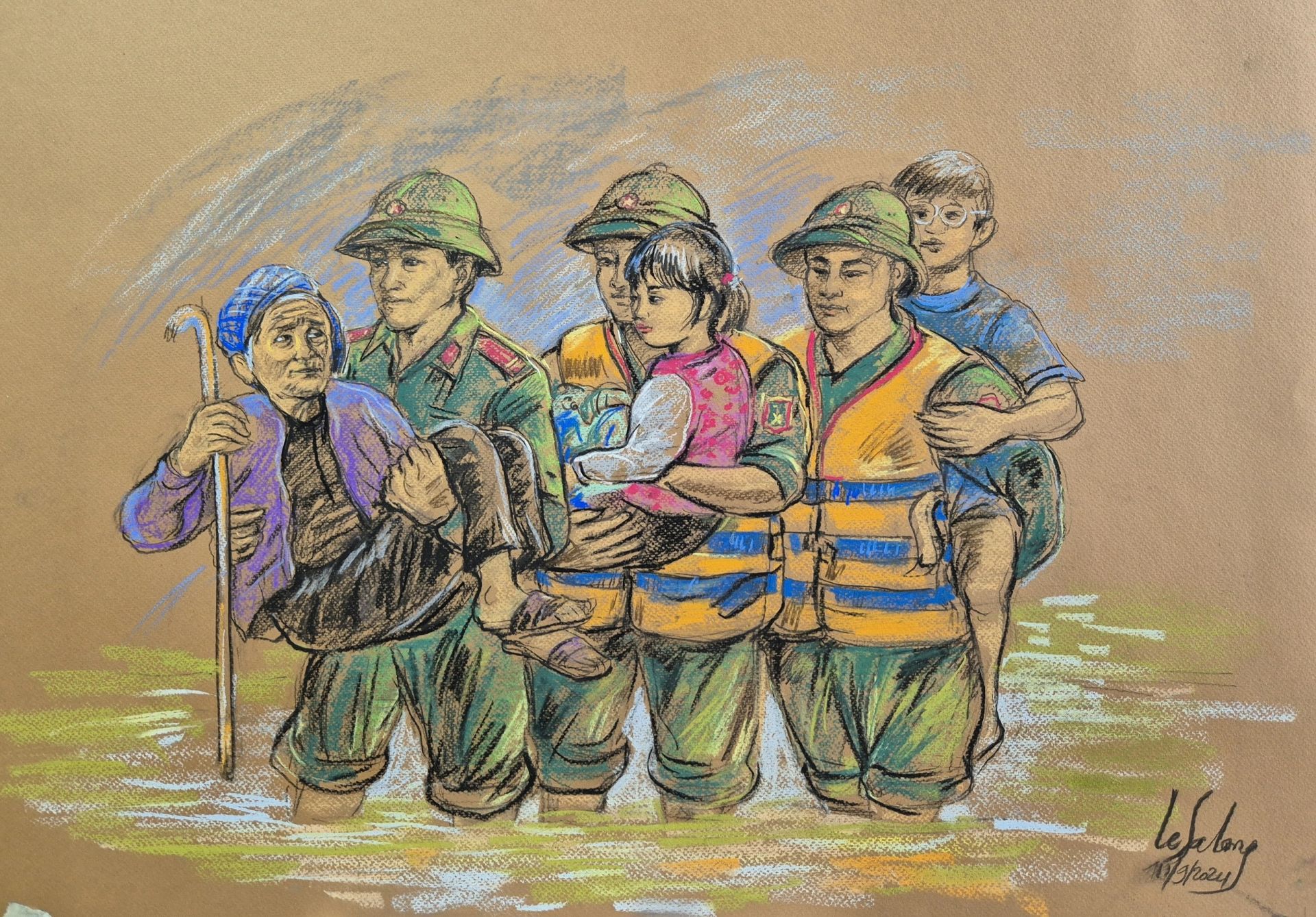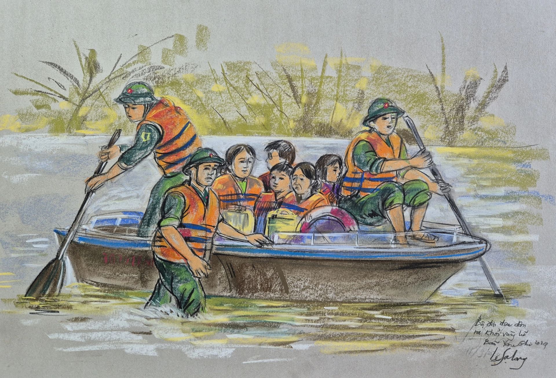Bộ đội giúp dân sơ tán ra khỏi vùng lũ (tranh vẽ)