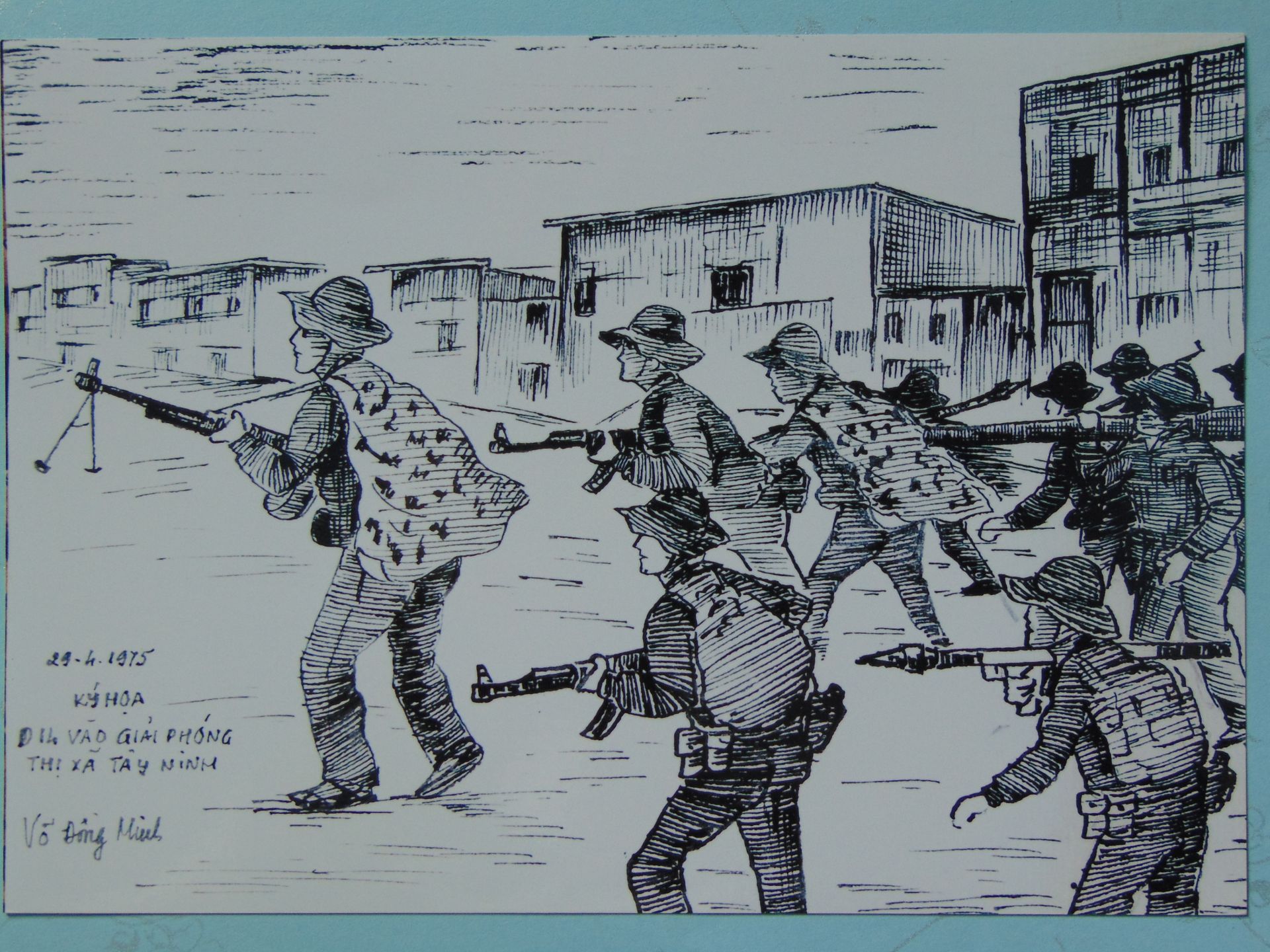 Giải phóng quân tiến vào thị xã Tây Ninh ngày 29.4.1975- ký hoạ Võ Đồng Minh, tư liệu của Nguyễn Quốc Việt.