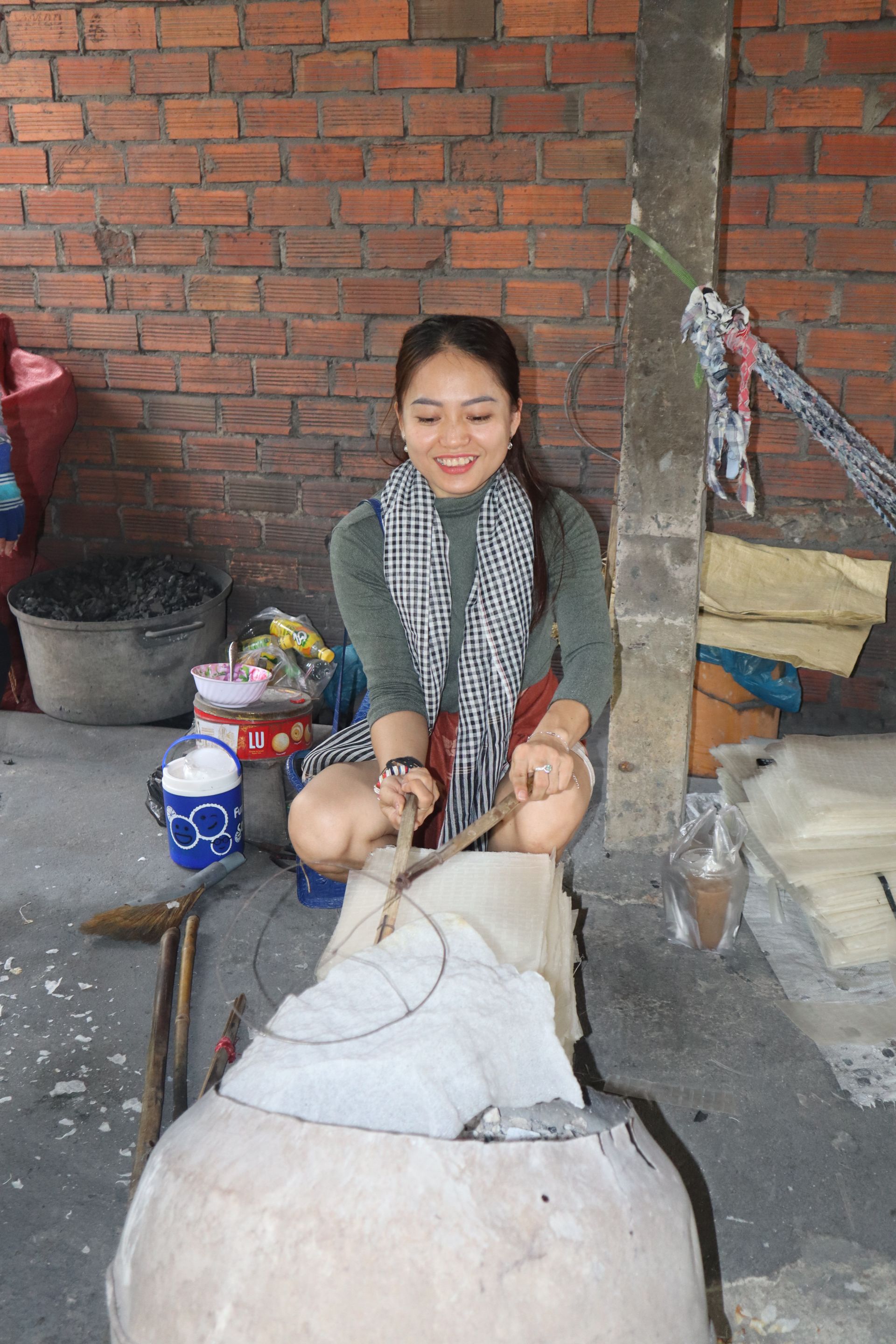 Du khách được trải nghiệm nướng bánh tráng tại cơ sở sản xuất bánh tráng trên địa bàn thị xã Trảng Bàng.