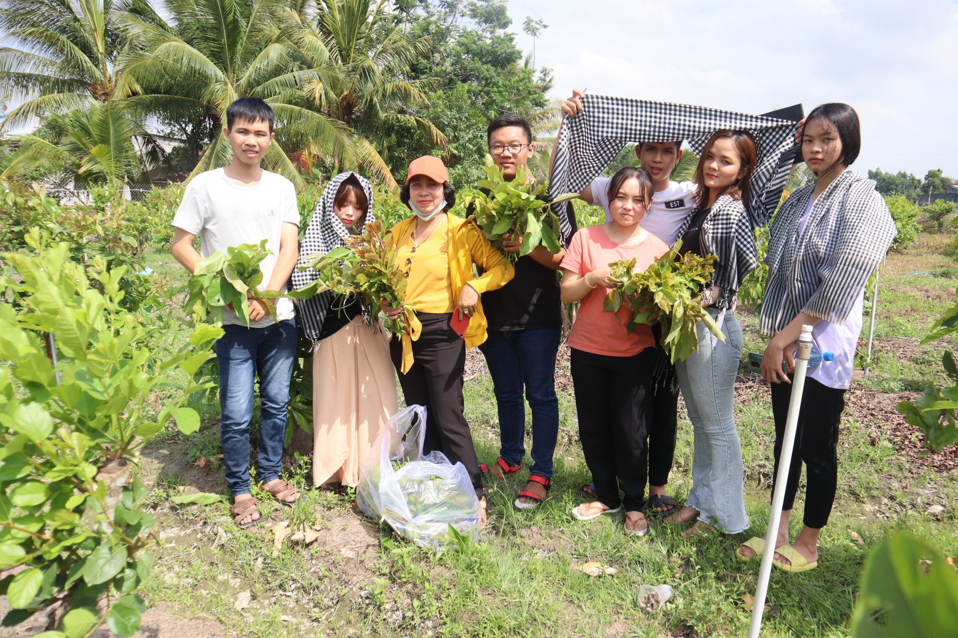 Du khách trải nghiệm hái rau rừng tại cơ sở sản xuất bánh tráng phơi sương, đóng gói rau đặc sản Trảng Bàng.