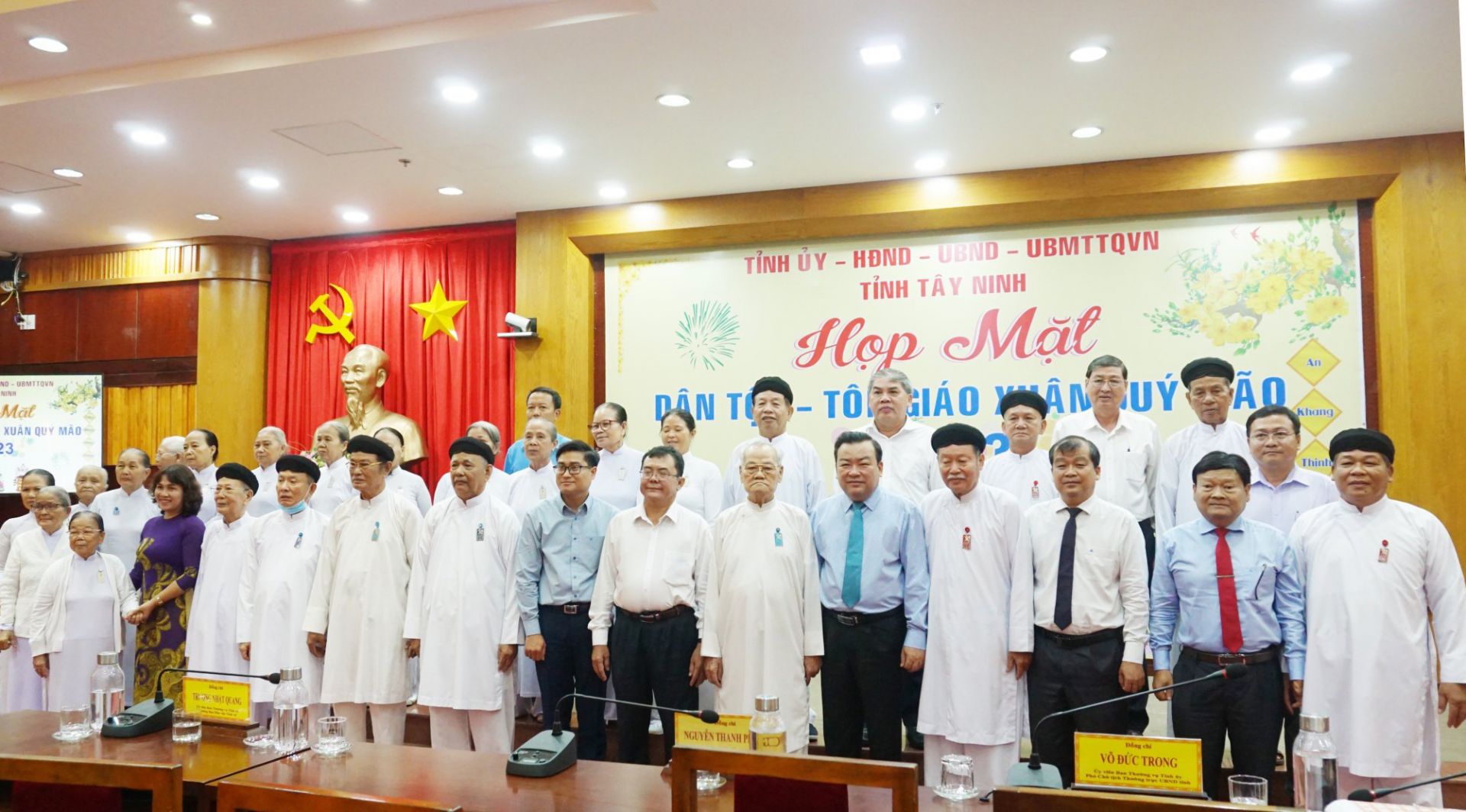Lãnh đạo tỉnh chụp ảnh lưu niệm với chức sắc tôn giáo Cao Đài tại buổi họp mặt tôn giáo, dân tộc năm 2022.