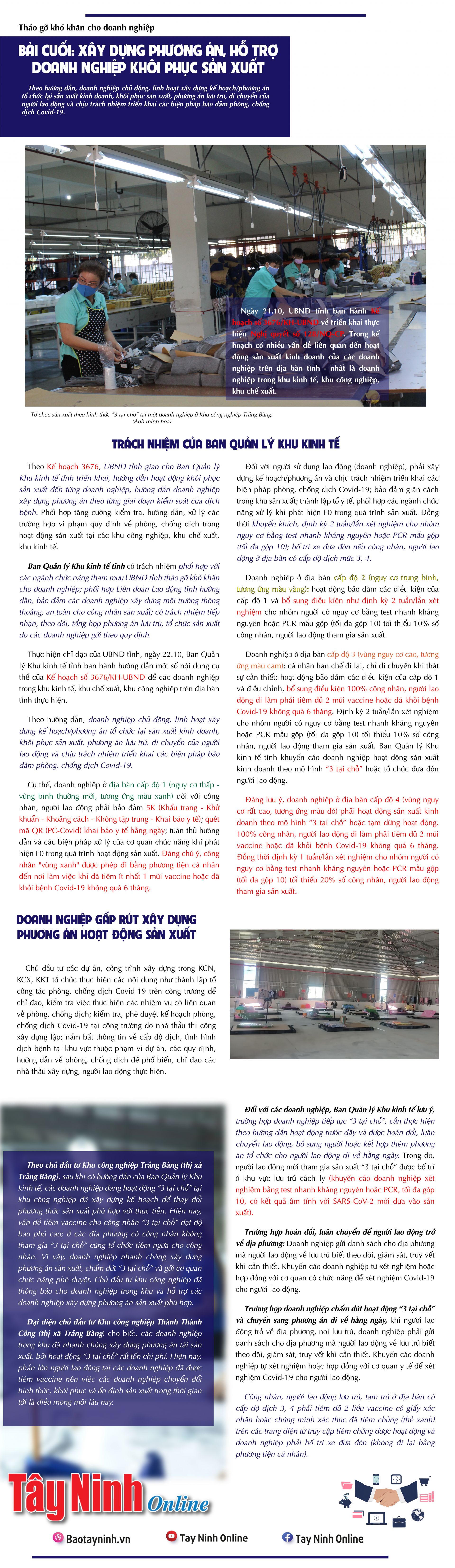 Theo hướng dẫn, doanh nghiệp chủ động, linh hoạt xây dựng kế hoạch/phương án tổ chức lại sản xuất kinh doanh, khôi phục sản xuất, phương án lưu trú, di chuyển của người lao động và chịu trách nhiệm triển khai các biện pháp bảo đảm phòng, chống dịch Covid-19. |