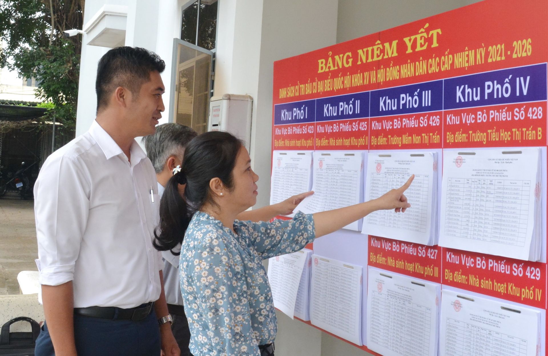 Đoàn kiểm tra công tác niêm yết danh sách cử tri.